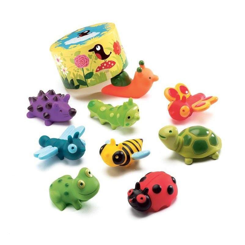 - Sættet indeholder: 9 små dyr (sommerfugl, mariehøne, bi, snegl, pindsvin, frø, guldsmed, skildpadde, larve), 1 kasse til at gemme dyrene i, 15 tællekort med blomster og blade