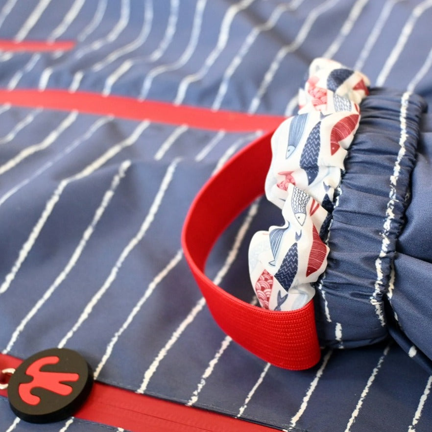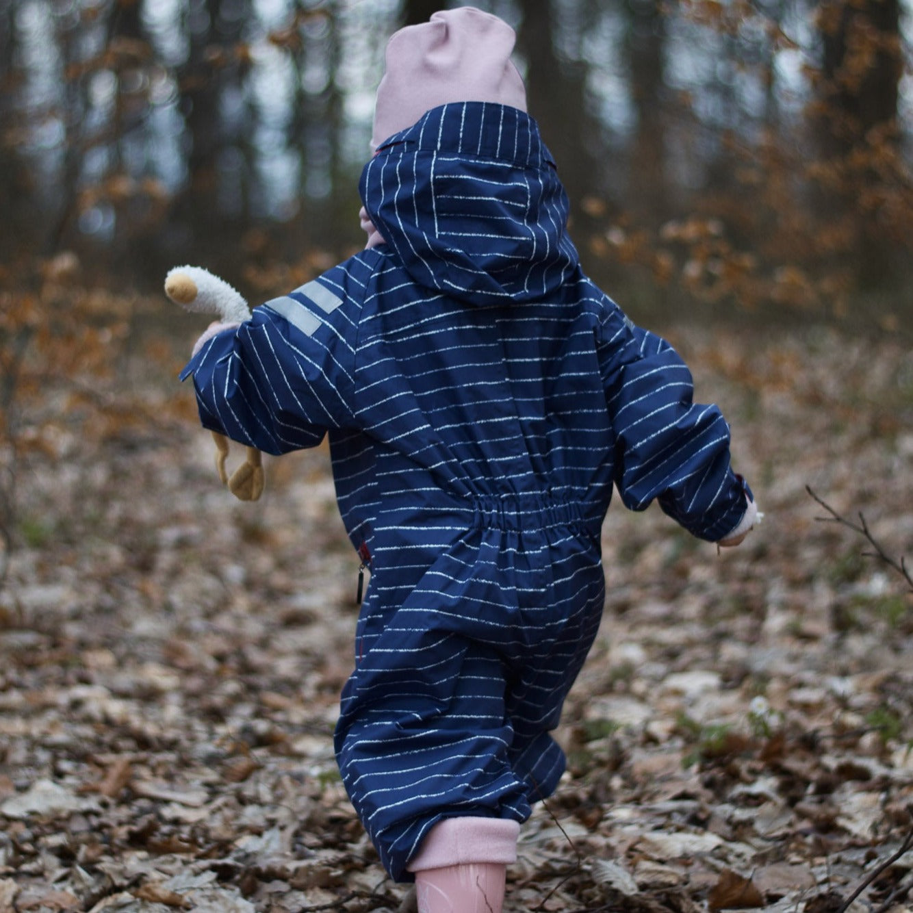 Børnedragten kan foldes sammen i en lille lomme, der er placeret på indersiden af benet.