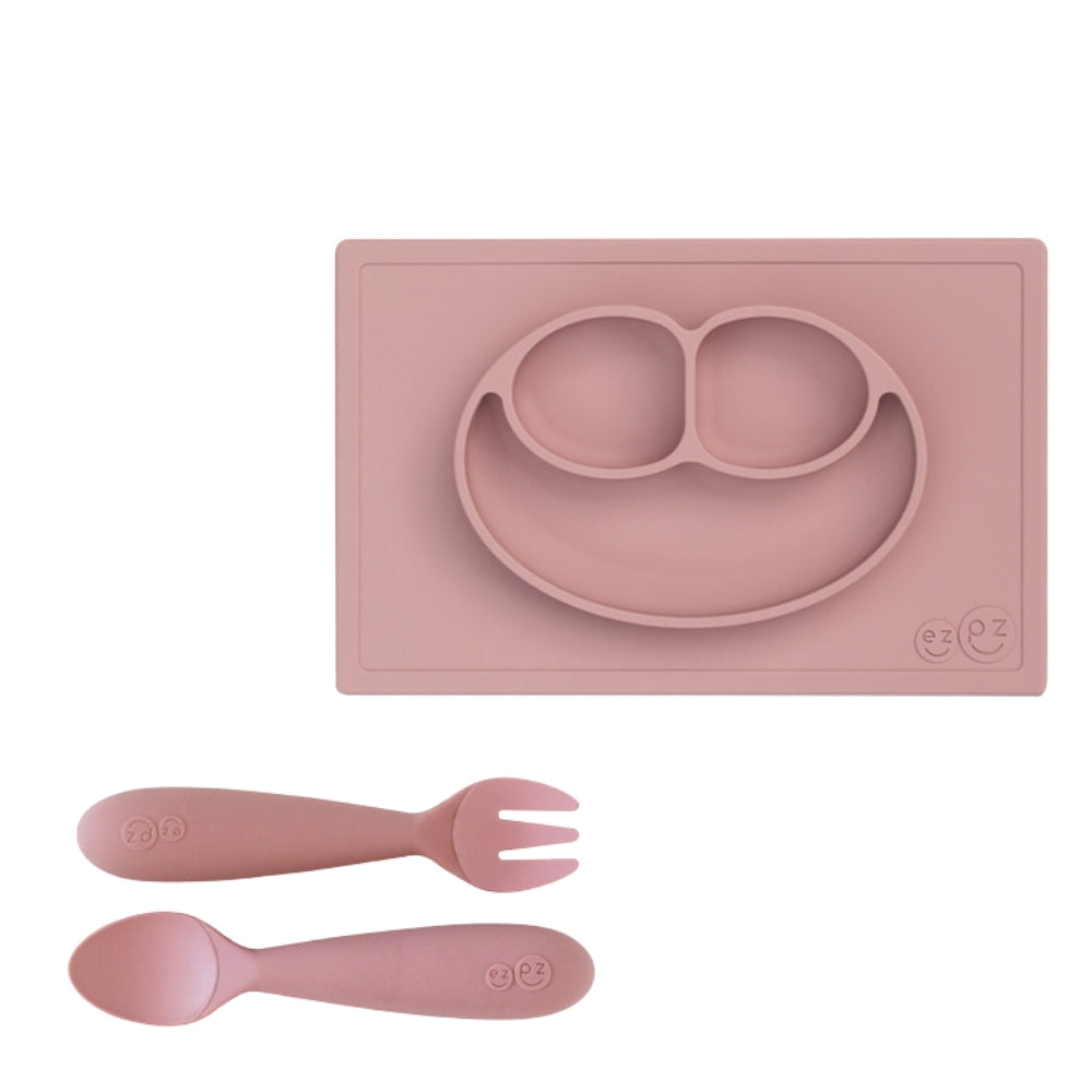 2-i-1 sugekop-tallerken Happy Mat + sæt silikone bestik i pastellrosa fra EZPZ.