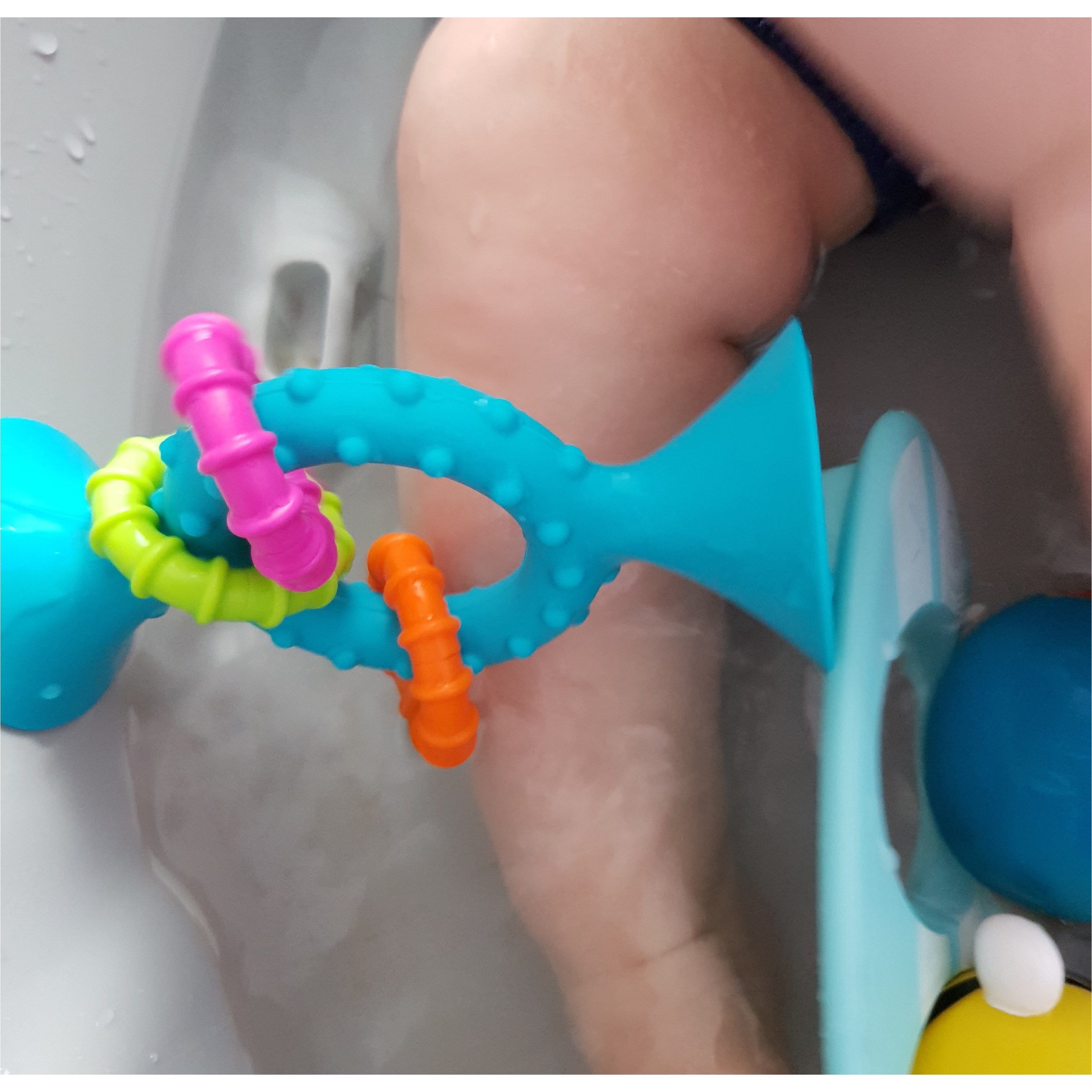 Legetøjet kan suges fast på badekarret, barnevognen og endda på køkkengulvet.