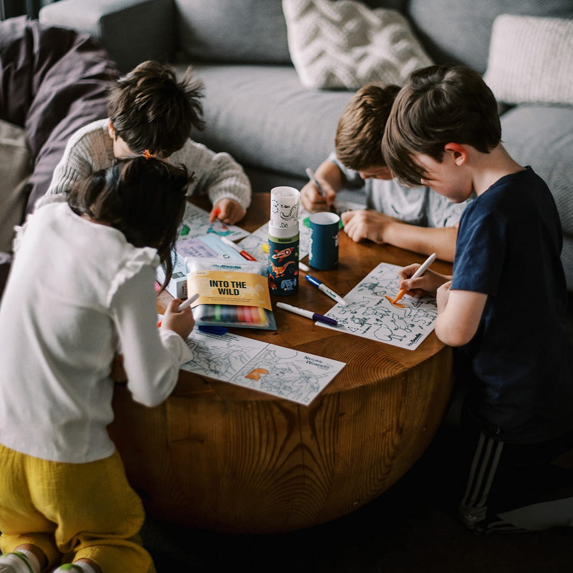 Der medfølger ni giftfri tuschpenne, der er specielt designet til små hænder og tørrer hurtigt for at forhindre, at farverne smitter af på måtten.