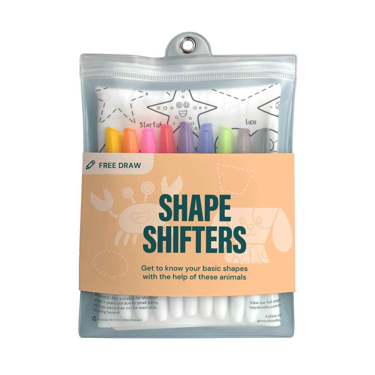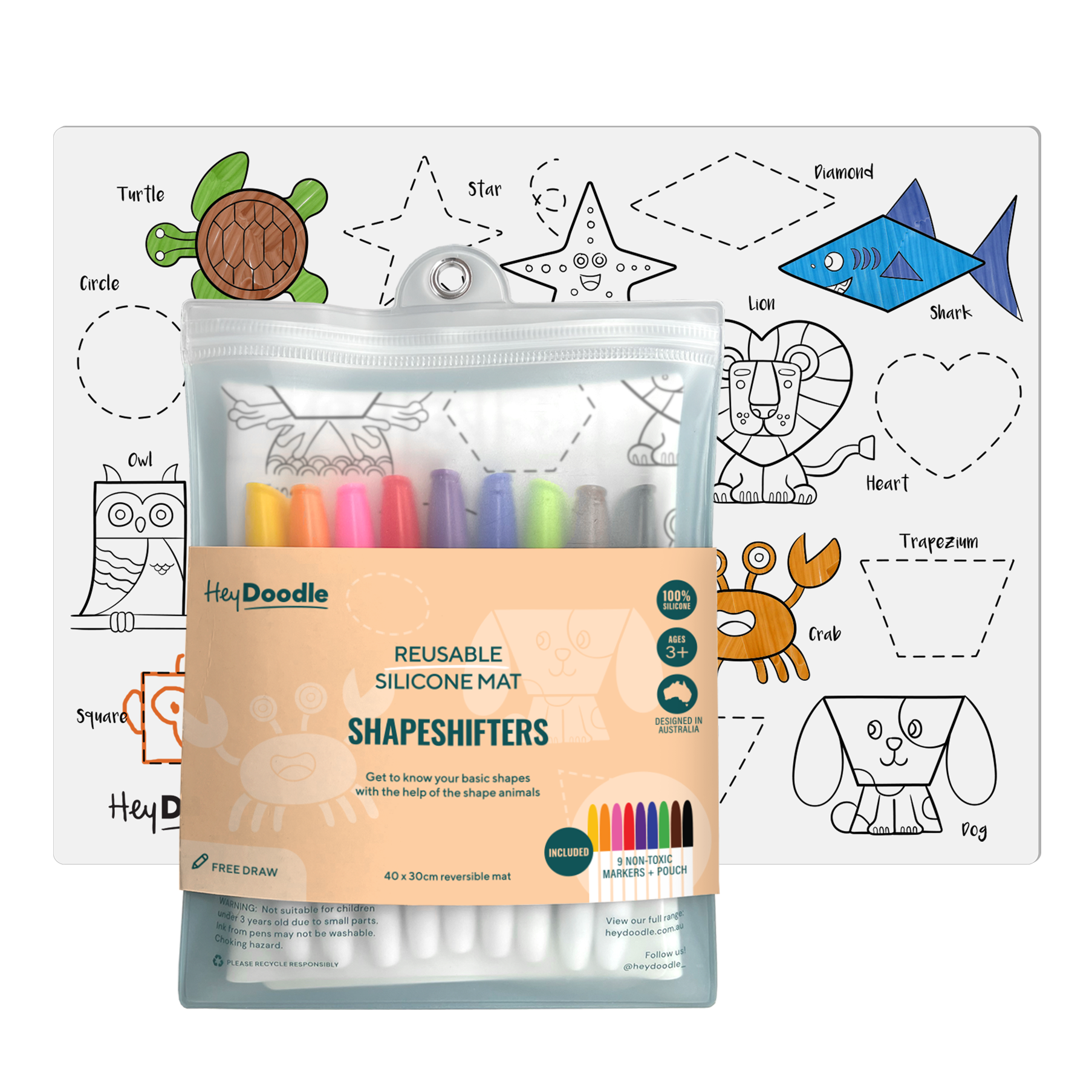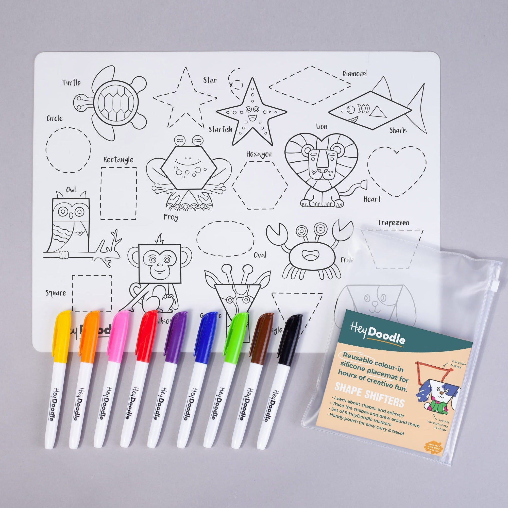 A3-silikonemåtten fra HeyDoodle er det perfekte redskab til at lære former og dyr gennem kreativt leg.