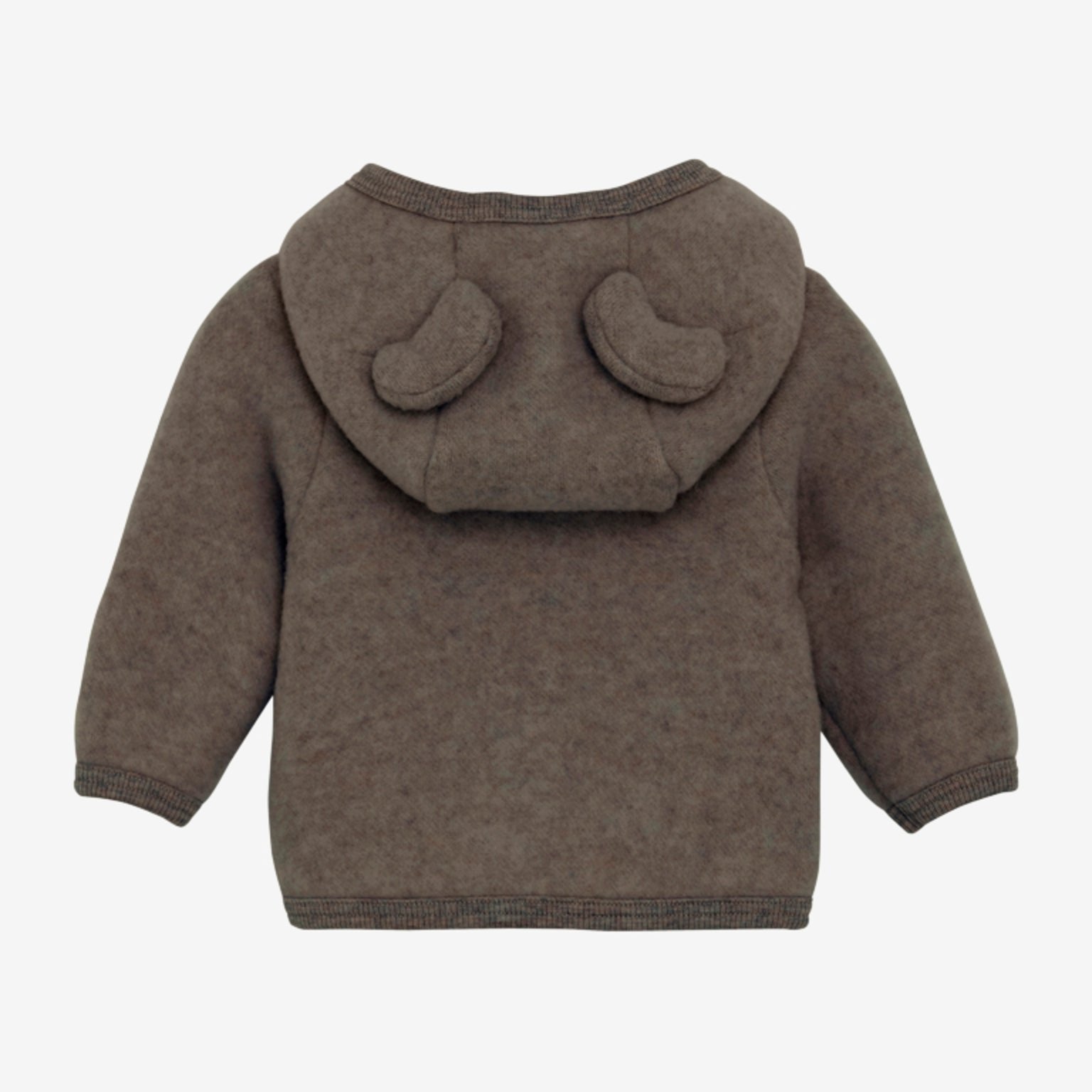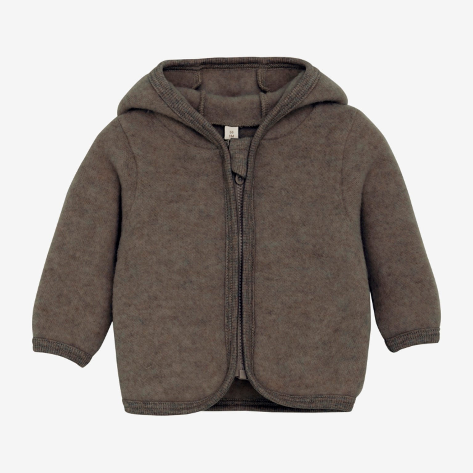 En sød Huttelihut-jakke lavet af brun melange uldfleece.