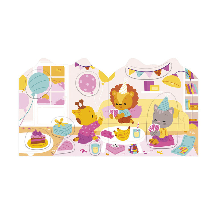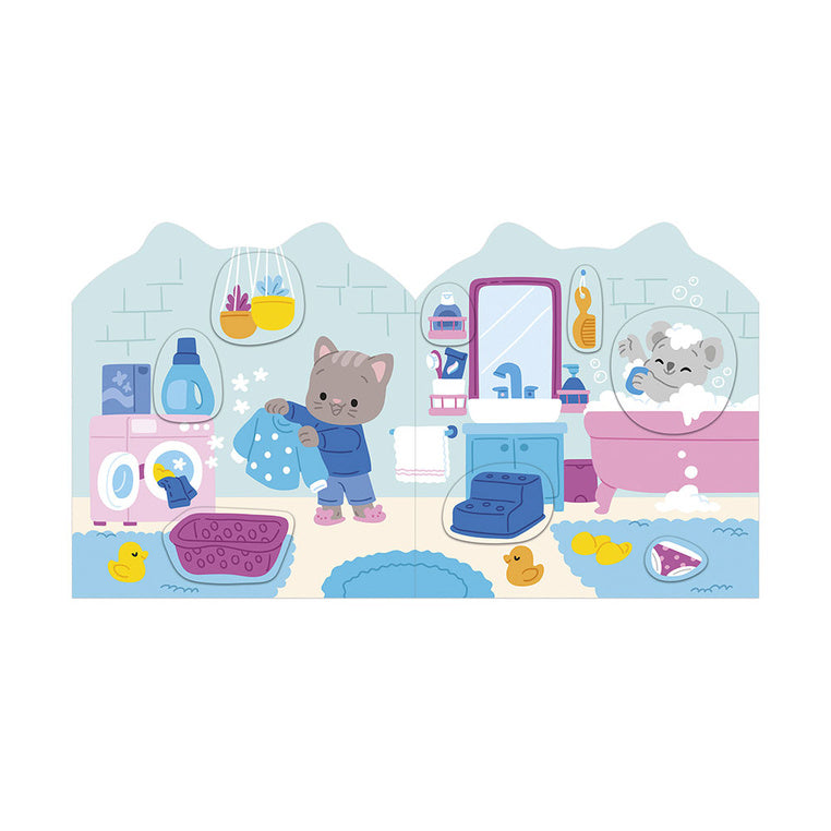 På denne måde kan barnet følge hovedpersonen – en grå kat – gennem hans daglige aktiviteter, fortælle sine egne historier og udvikle sin fantasi.