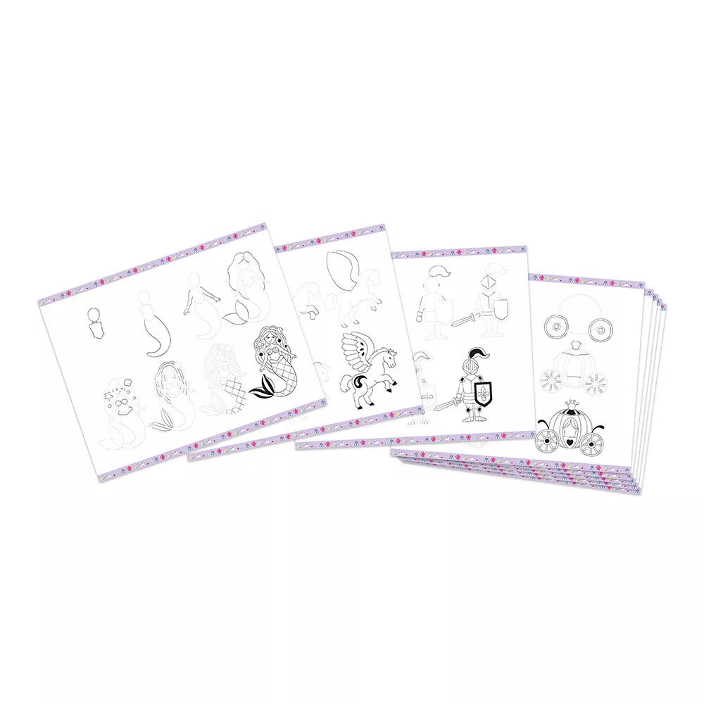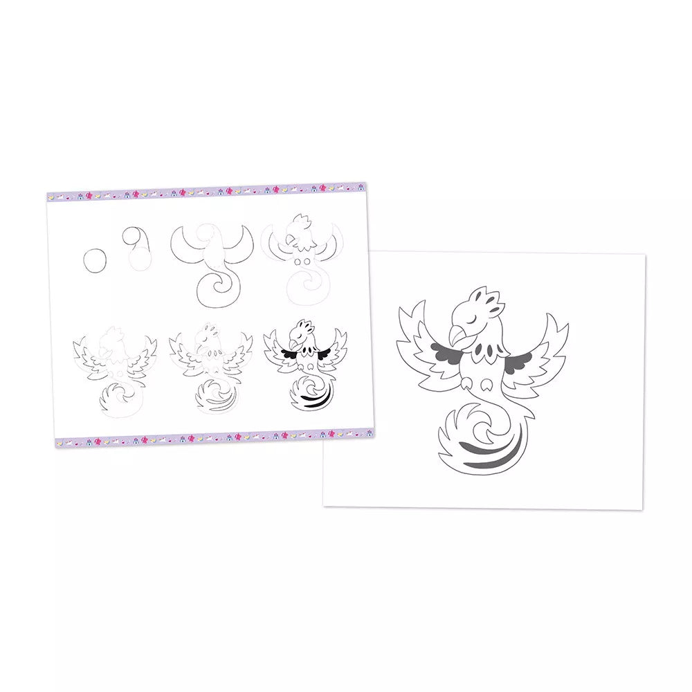 Trin for trin-tegning for børn fra Janod giver dig mulighed for at skabe unikke billeder, der blandt andet viser drager, en føniks og mange andre eventyrlige væsner.