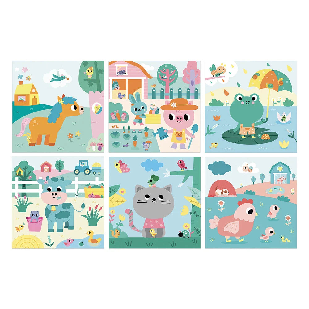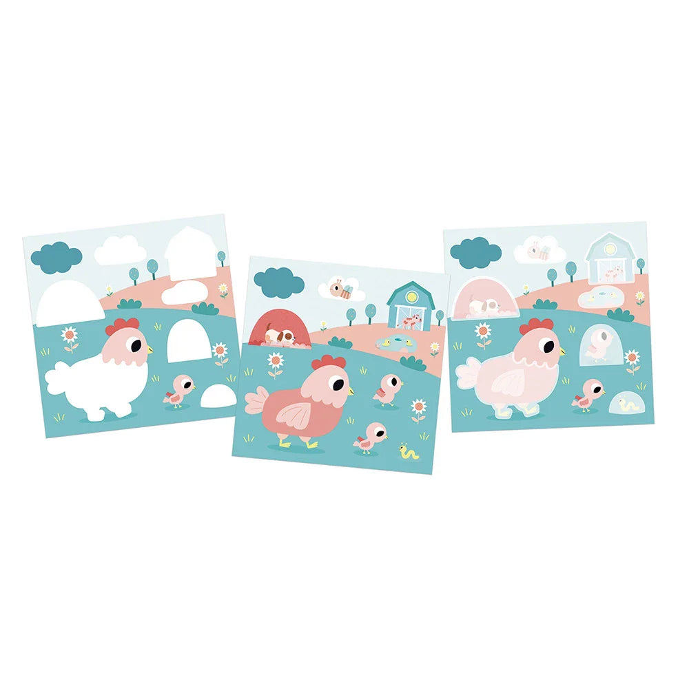 Inde i sættet finder du muntre bondegårdsdyr, der opfordrer dig til at fortælle historier og navngive det, du ser i scenerne sammen.