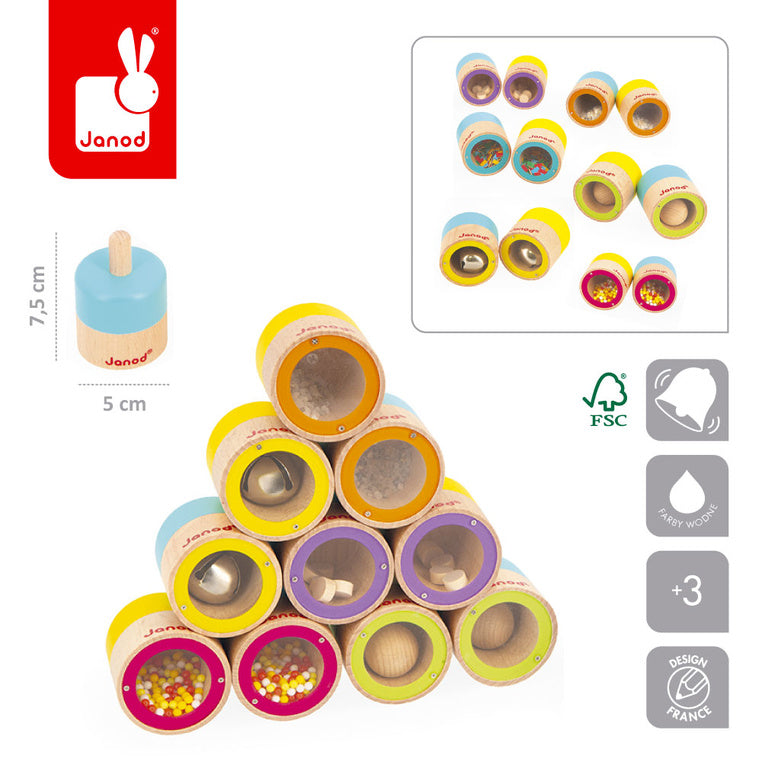 - Sættet indeholder: 6 par trærasler, der hver især afgiver en forskellig lyd.