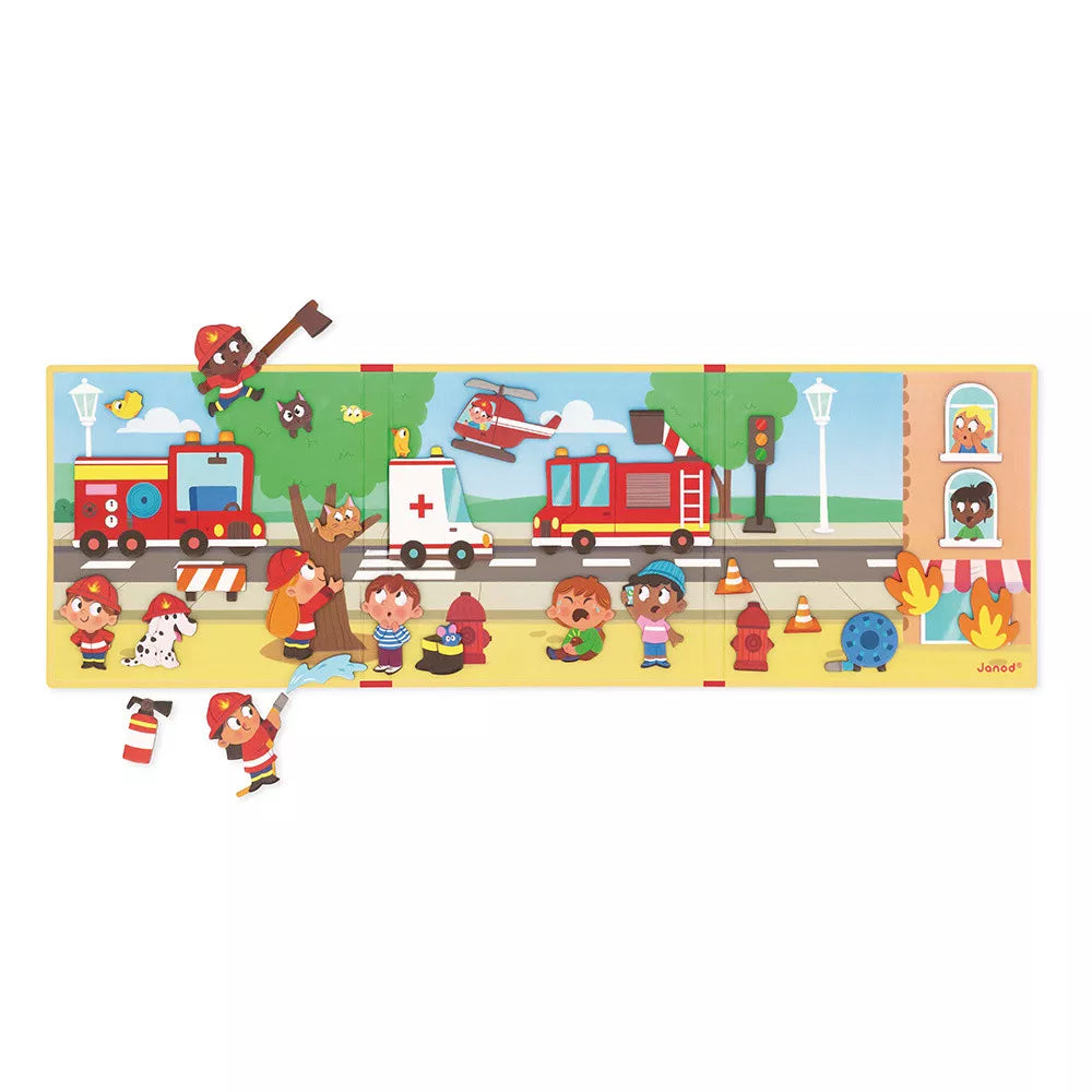 Janods magnetiske puslespil indeholder 30 magneter med brandmænd , ild, dyr, køretøjer og andet redningsudstyr.