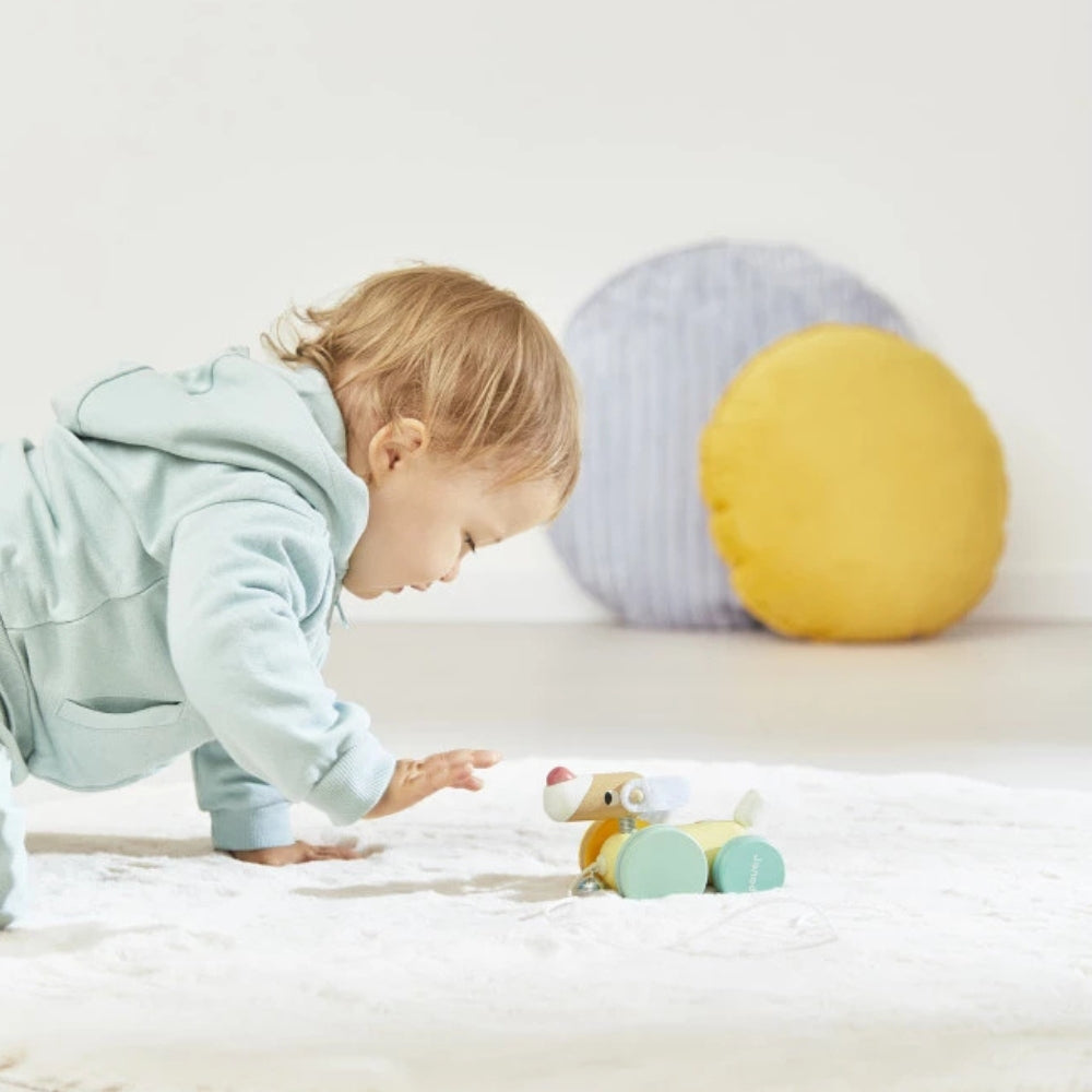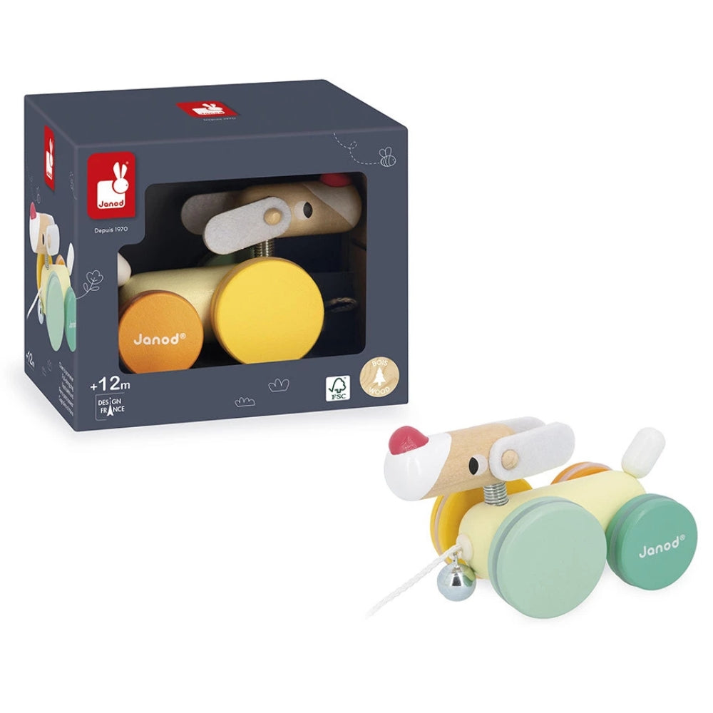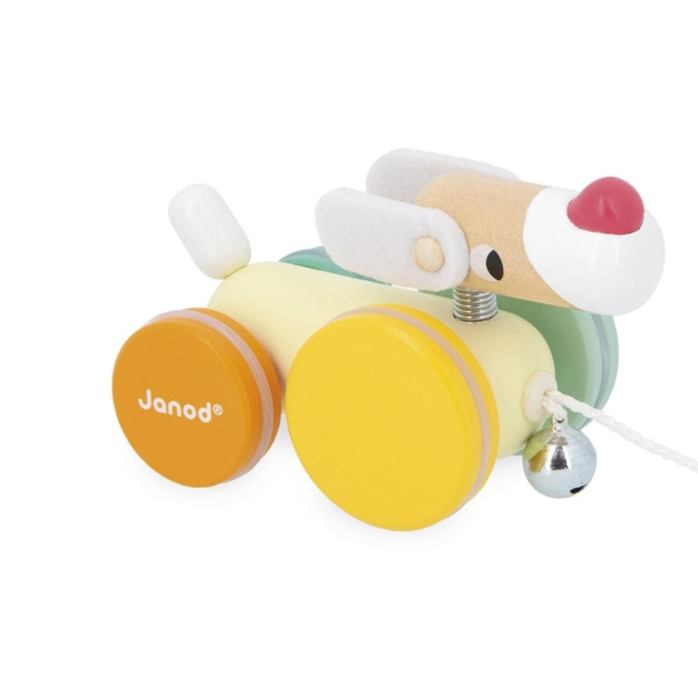 Janod-træklegetøjet er en sød, farverig hund på hjul, der hurtigt bliver en favoritkammerat på små gåture.