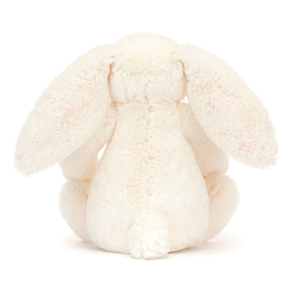 Jellycats 18 cm store cremefarvede 'bær'-kaninmaskot med blomsterører er ikke kun et blødt krammedyr, men udstråler også blødhed og charme.