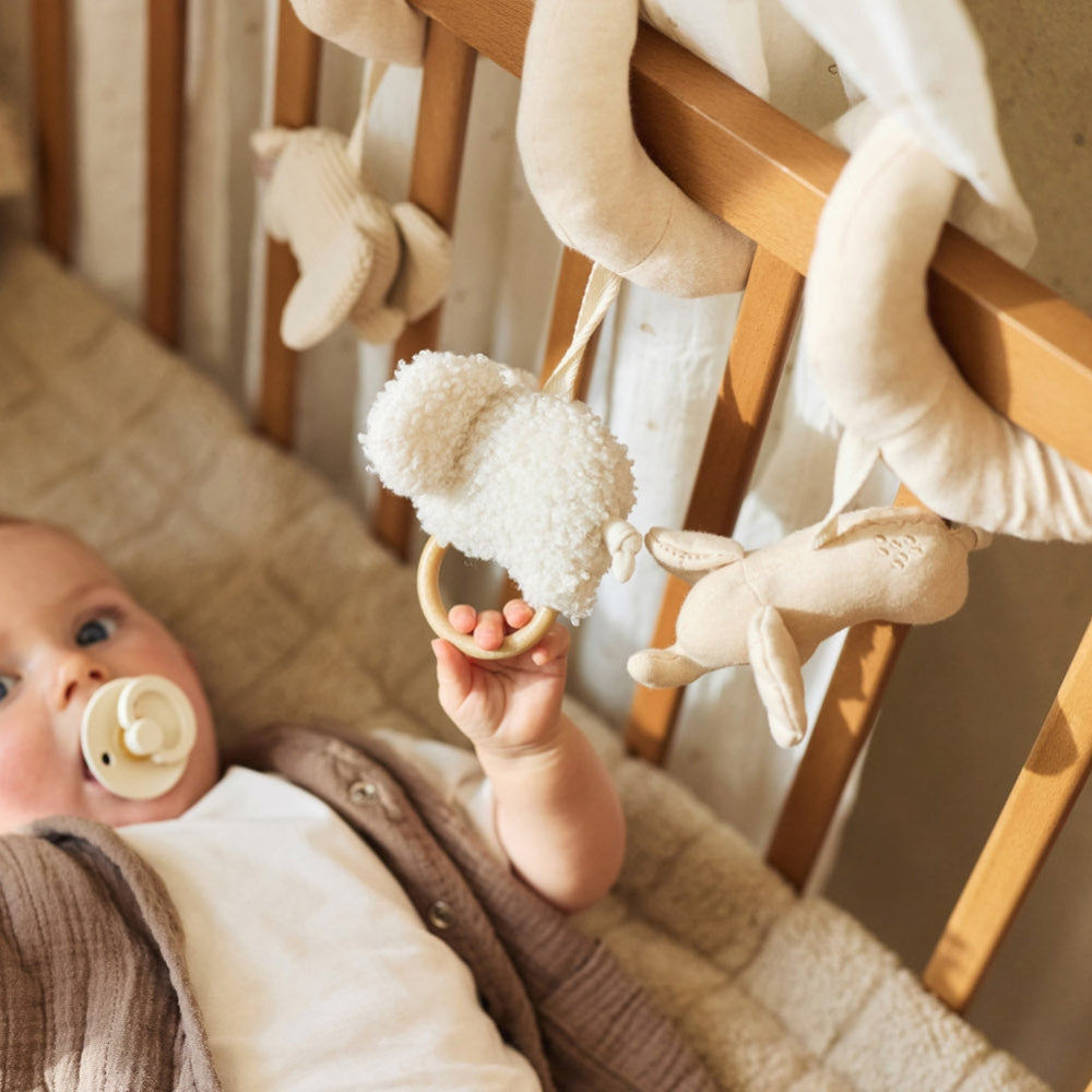 Die Marke Jollein hat ein Produkt geschaffen, das die Funktion eines sensorischen Spielzeugs mit der eines praktischen Zusatzes für den Kinderwagen oder das Kinderbett verbindet.