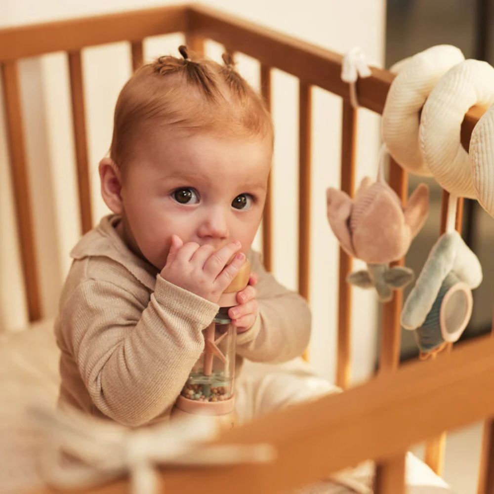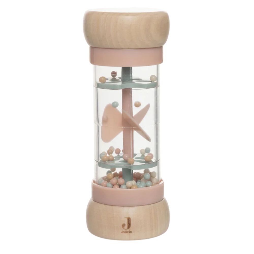 Tilføj et strejf af farve og lyd til dit barns hverdag med denne muntre babyrangle i form af et regnrør!