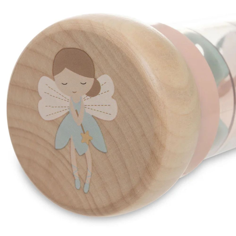 Inde i den gennemsigtige cylinder er der farverige kugler, der hopper muntert, når legetøjet bevæges, og skaber en blid og behagelig lyd, der minder om regn, der falder.