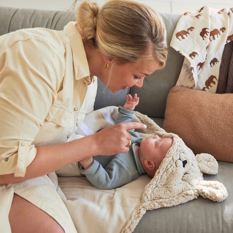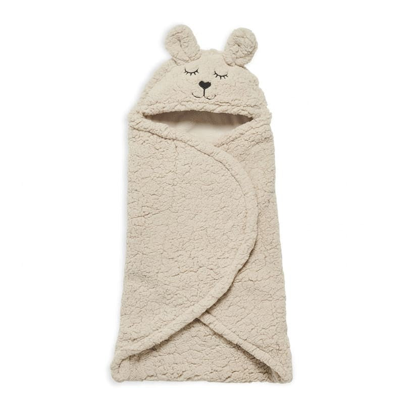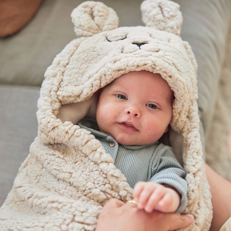 Den omslutter babyen blidt og holder varmen omkring den lille, og den behagelige hætte med søde ører beskytter hovedet yderligere mod kulden.
