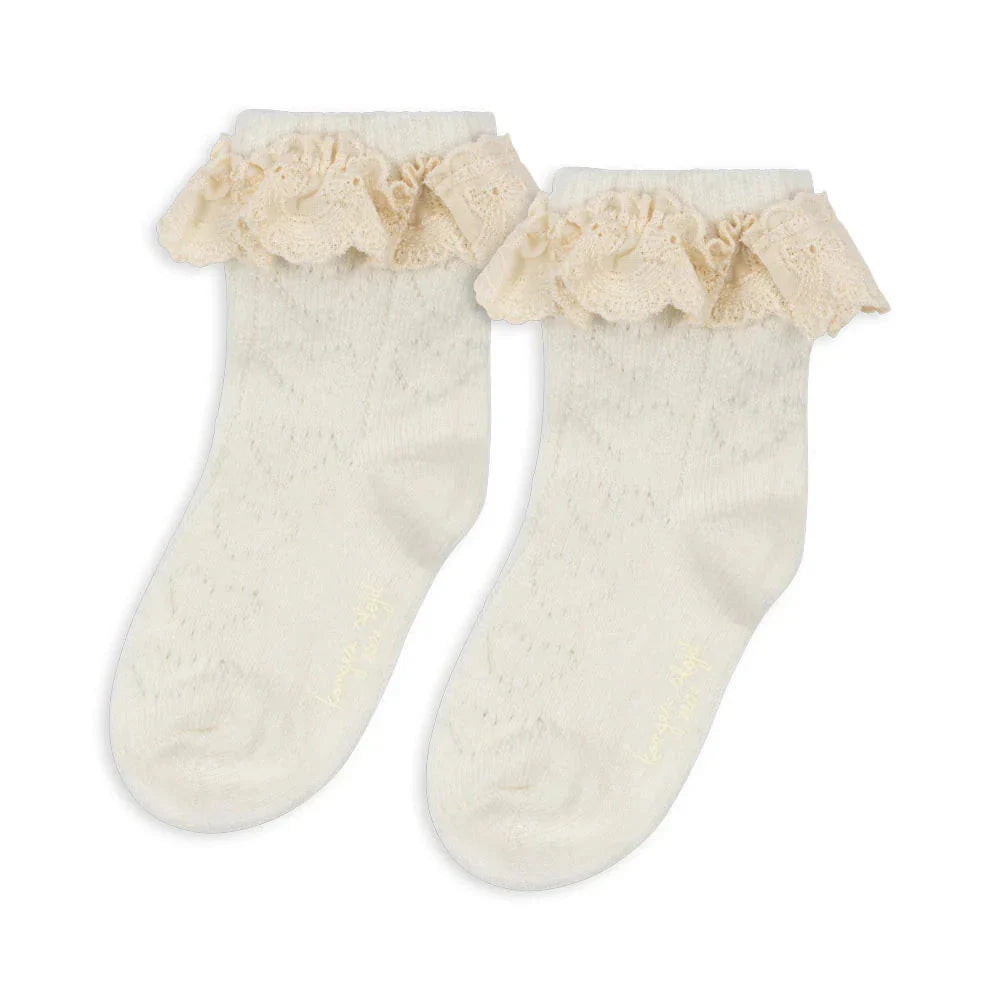 Konges Slojd børnesokker er dekoreret med et sødt mønster, der giver ethvert outfit karakter, mens den delikate dekorative kant ved elastikken tilføjer et subtilt touch.