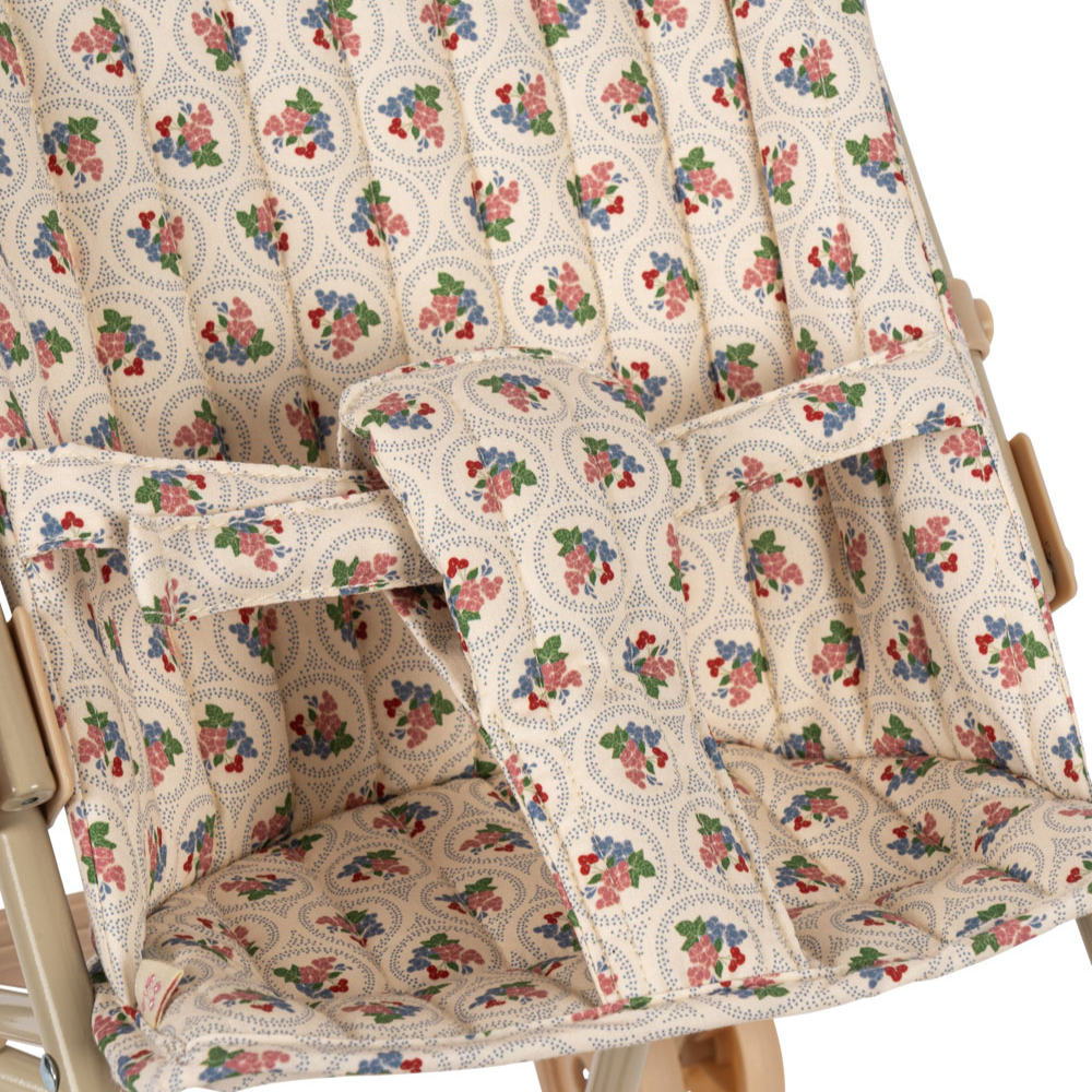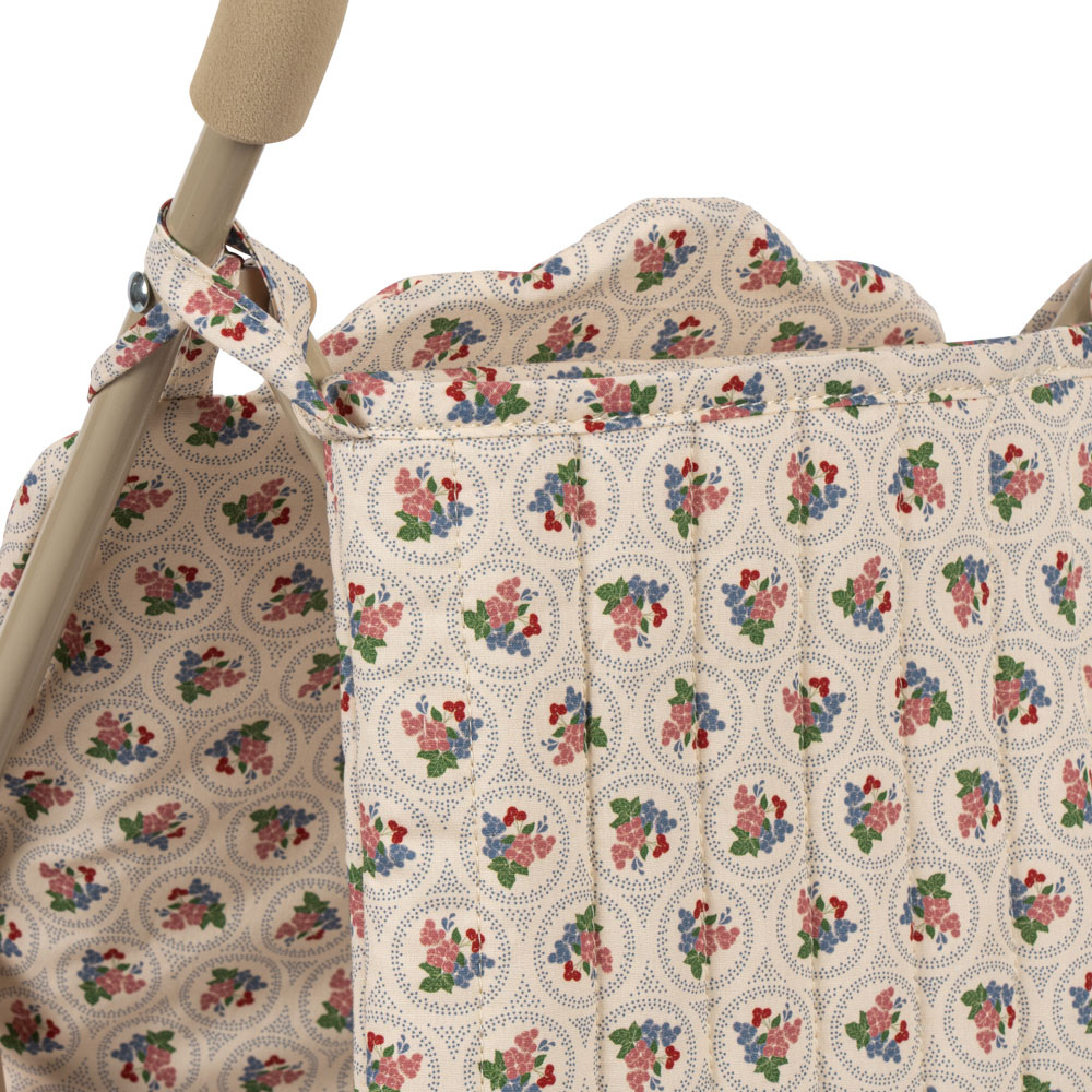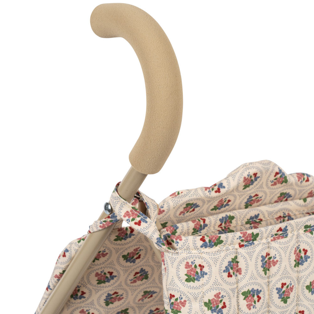 Dukkevognen fra Konges Slojd kombinerer en robust metalramme med blødt tekstil for at skabe et praktisk og stilfuldt tilbehør, der kan bruges i mange år.