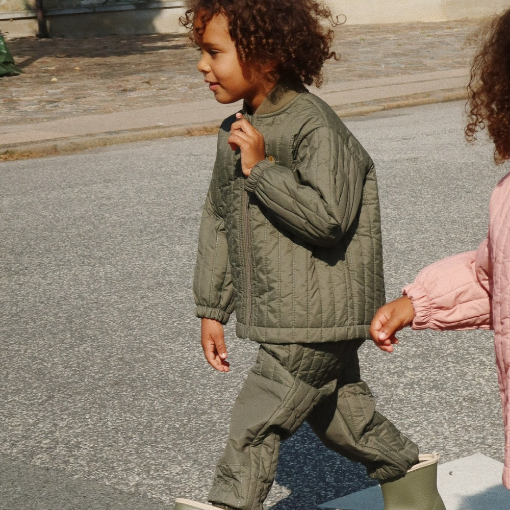 Dette lette og bløde sæt består af bukser og en tætsiddende jakke, der giver varme og bevægelsesfrihed både i børnehaven og på vej til skole.