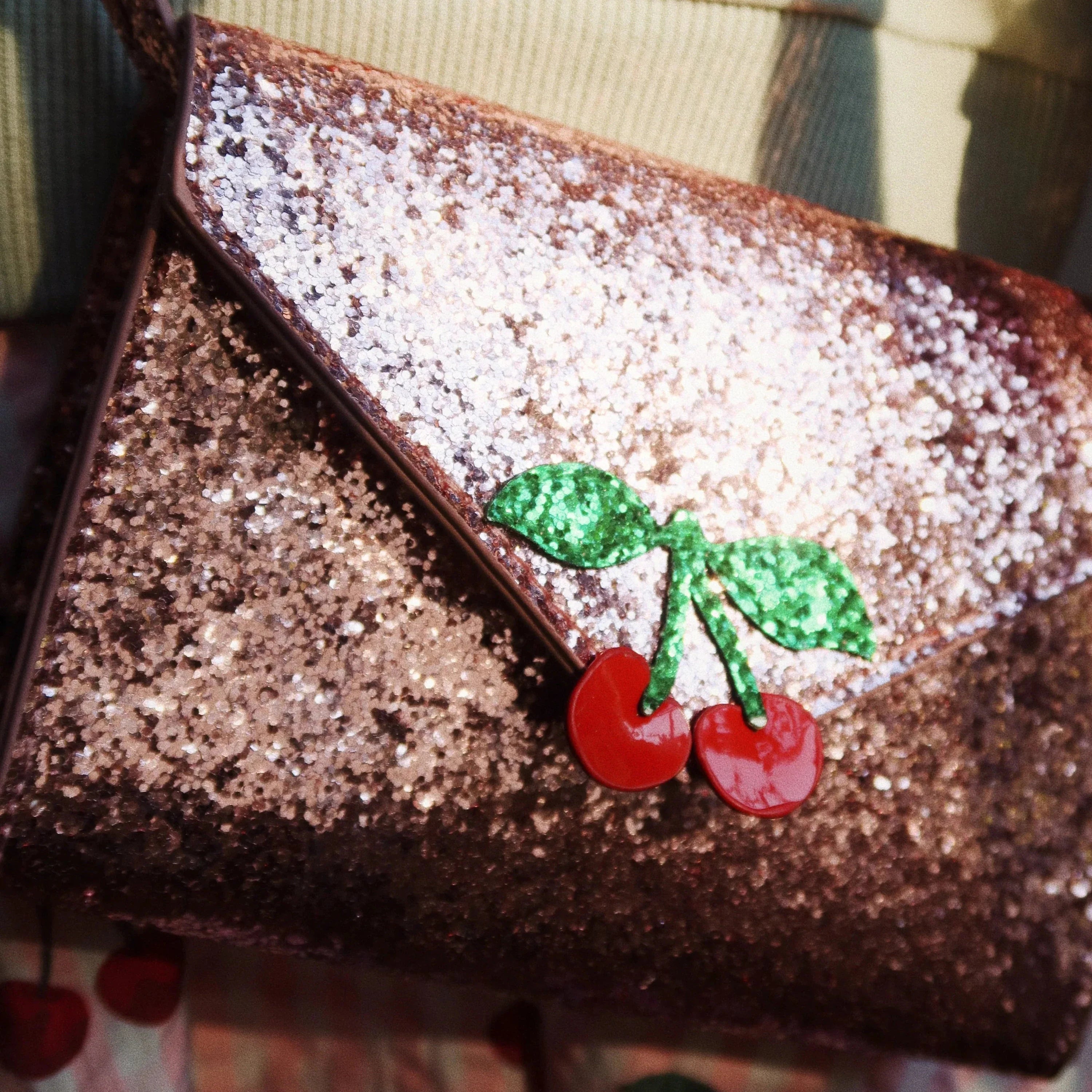 Dekoreret med pink glitter og grafik med søde kirsebær.