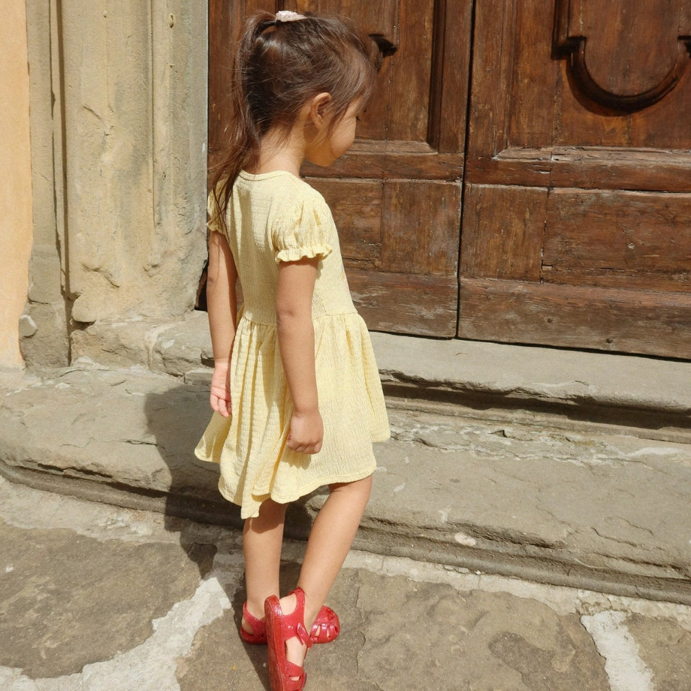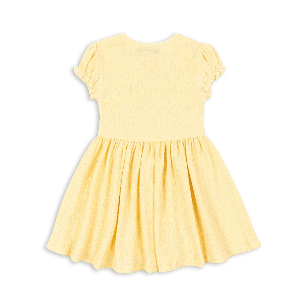 Der weiche, dehnbare Stoff passt sich sanft an die Figur Ihres Kindes an, während die dezenten Smokfalten und die kurzen Puffärmel für einen mädchenhaften Touch sorgen.