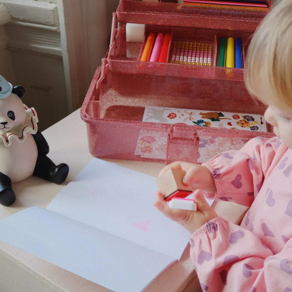 Den lille finder farvekridt, tuschpenne, frimærker og klistermærker, der inspirerer til nye ideer hver dag.