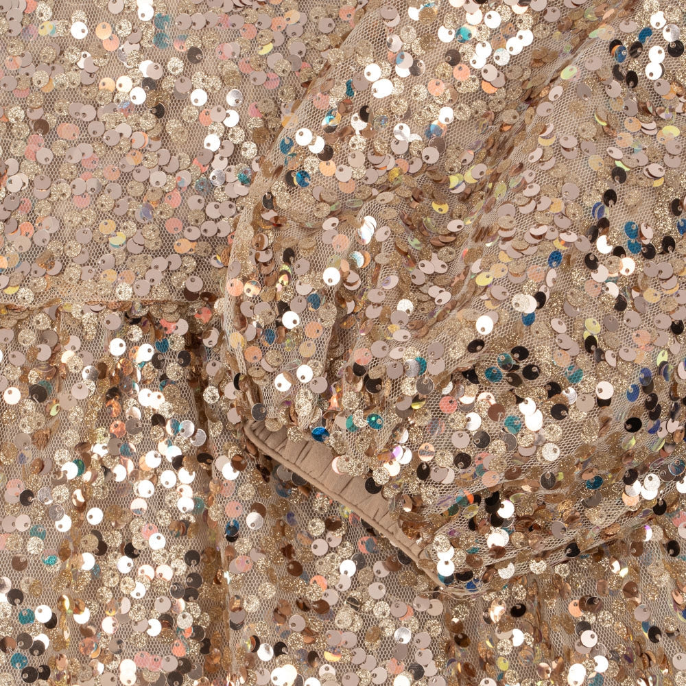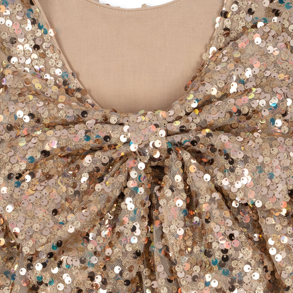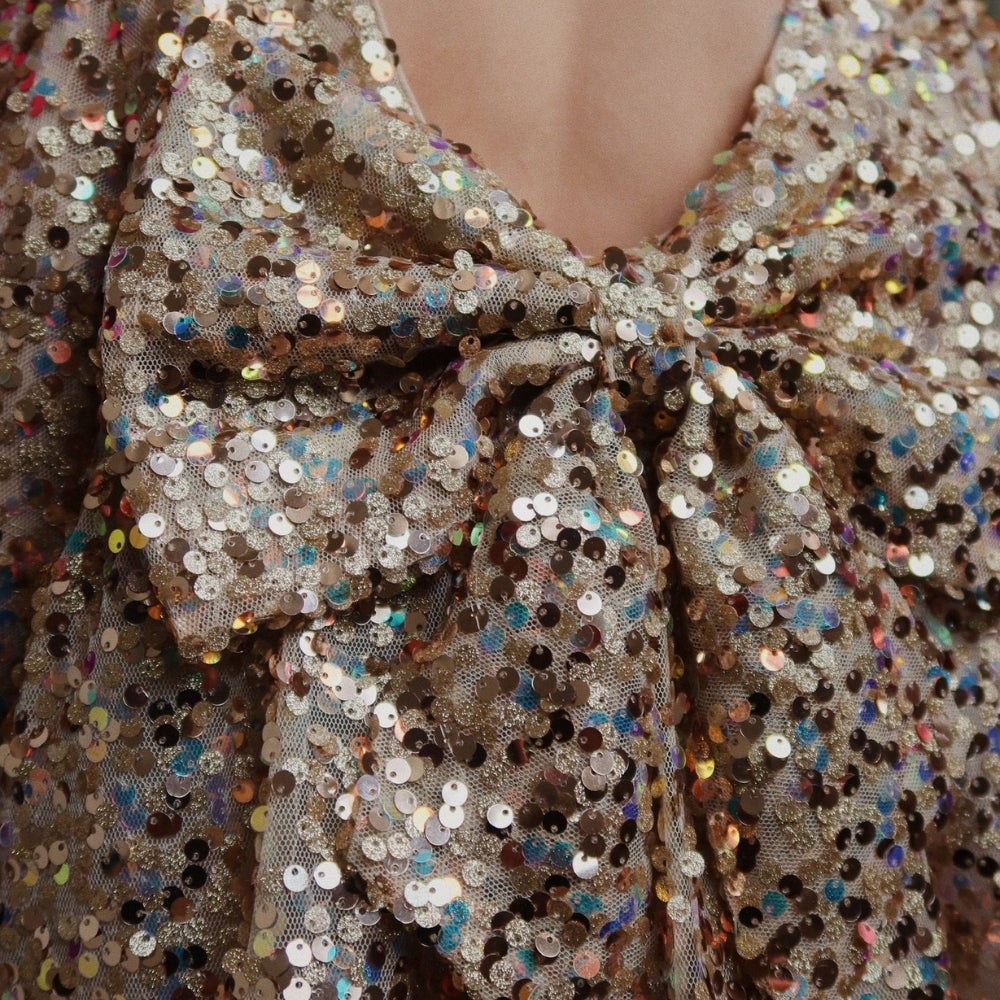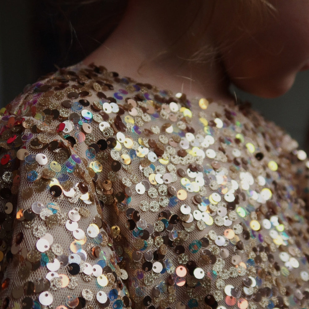 Hele kjolen er dækket af glitrende pailletter, der reflekterer lyset smukt og tiltrækker blikket.