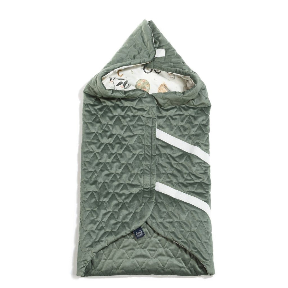 Et yderst praktisk tæppe, der blot fastgøres med velcro for at danne en hætte, der beskytter dit barns hoved.