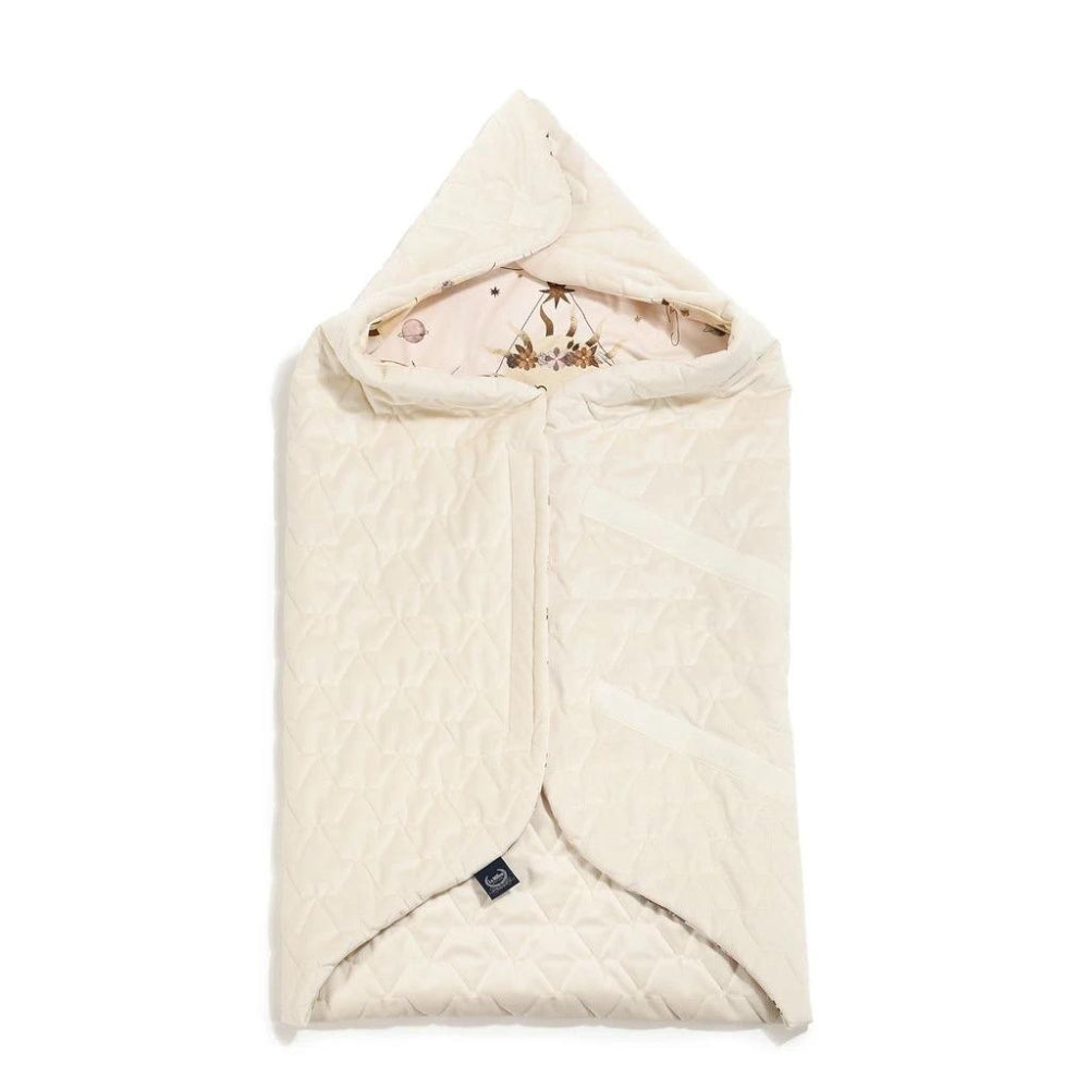 Et yderst praktisk tæppe, der blot fastgøres med velcro for at danne en hætte, der beskytter dit barns hoved.