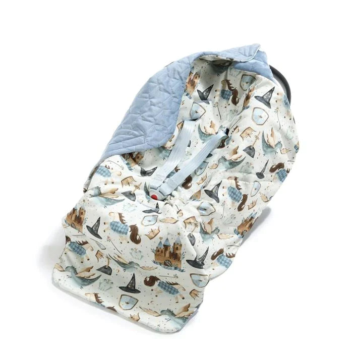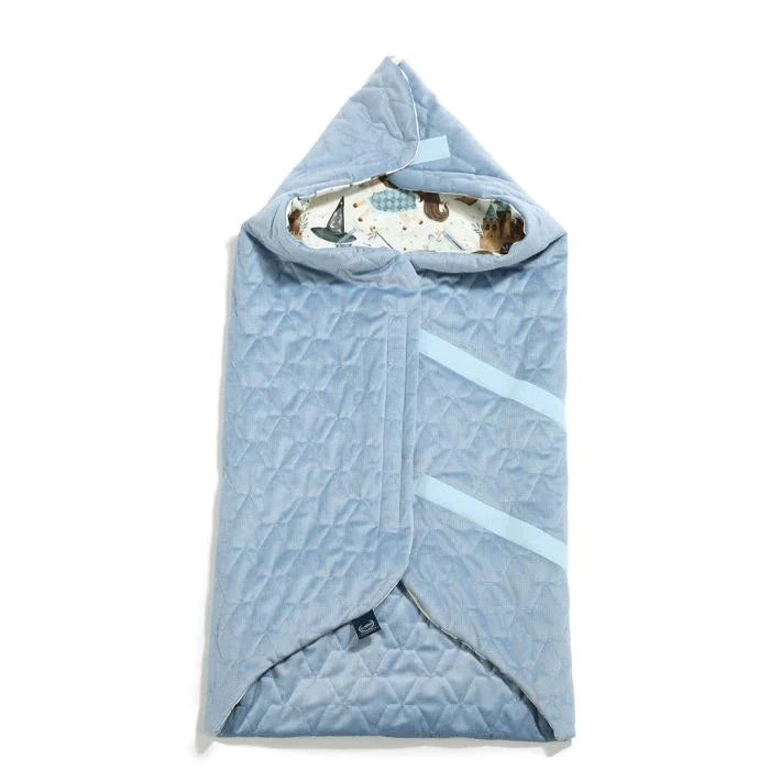 Et yderst praktisk tæppe, der blot fastgøres med velcro for at danne en hætte, der beskytter dit barns hoved.