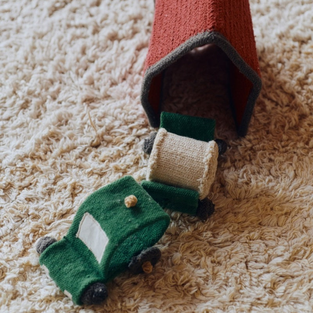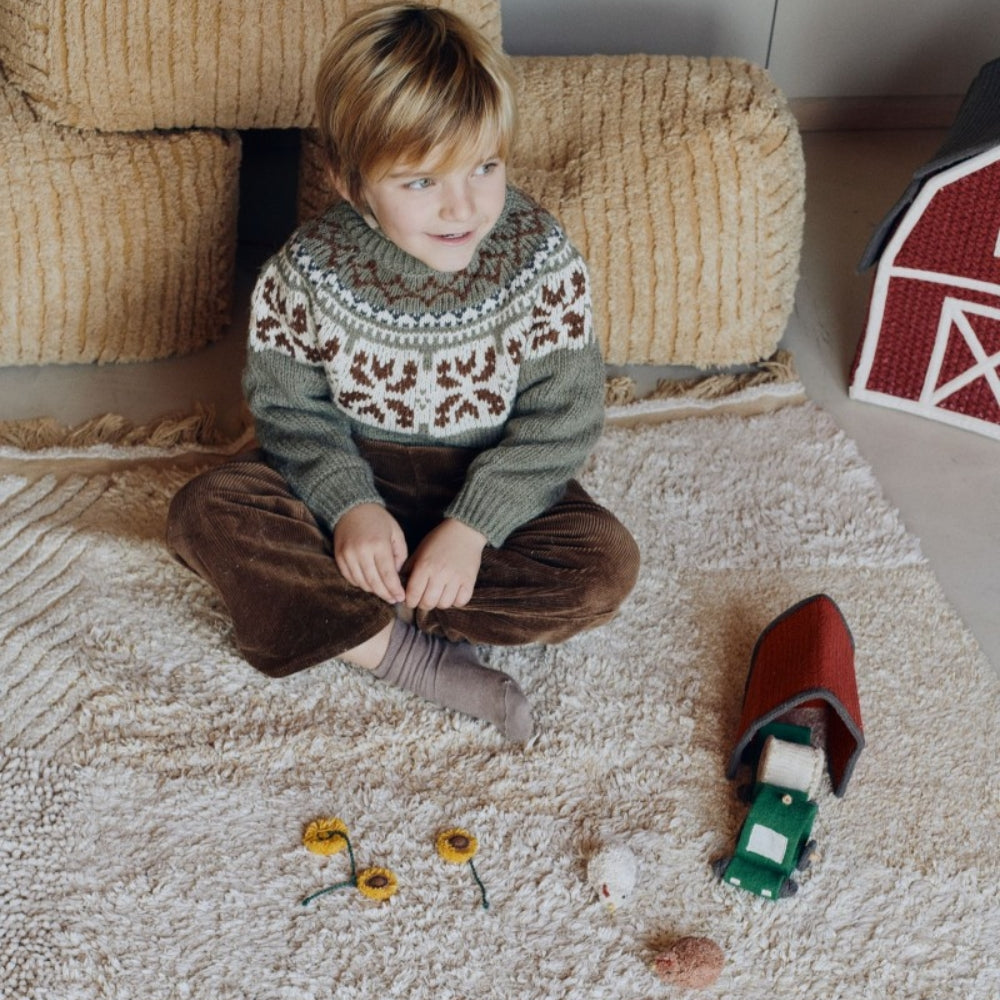 Hvert tæppe fra Lorena Canals er håndlavet, hvilket garanterer unikhed og højeste kvalitet. Som en ekstra bonus medfølger der 7 bomuldslegetøj – en mini-stald, en traktor, en kylling, en høstak og solsikker – som inspirerer til kreativt leg på gården.