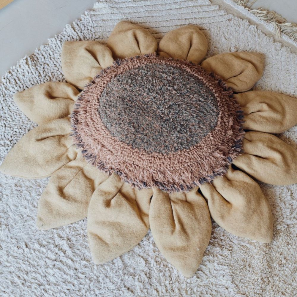Den runde pude er inspireret af solsikkens skønhed og imponerer med detaljer, der minder om honningfarvede kronblade og et trefarvet center, der imiterer en blomsterkerne.