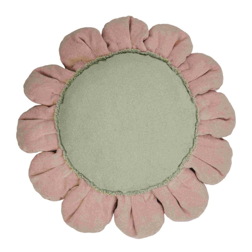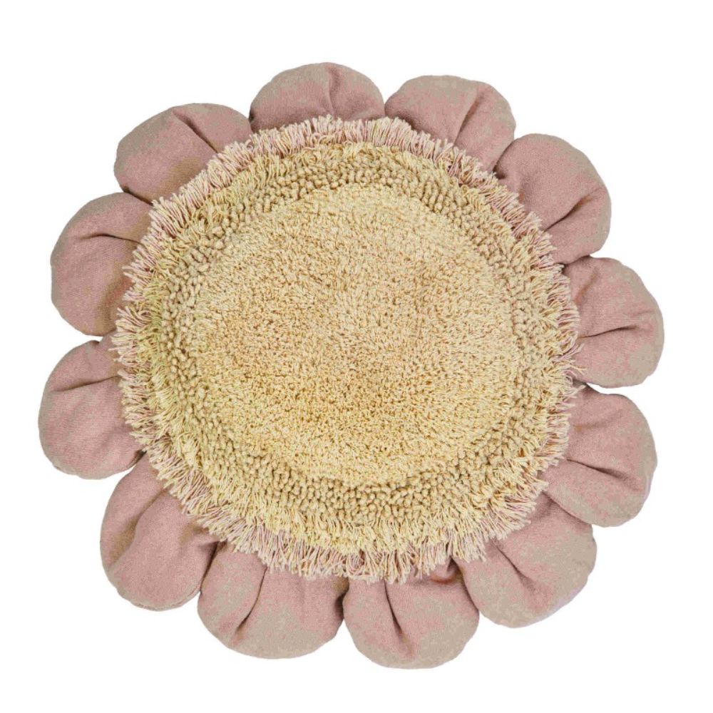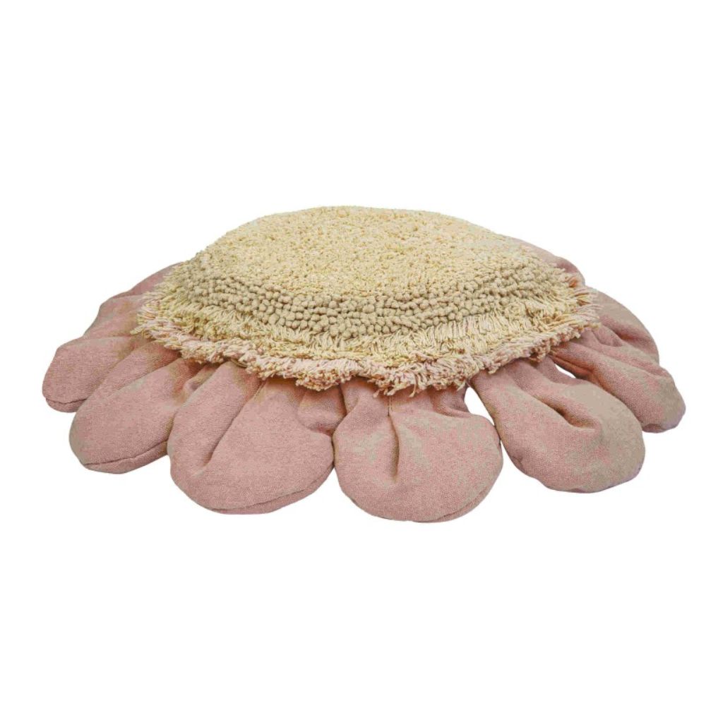 Inspireret af tusindfrydblomsten har Lorena Canals-puden lyserøde kronblade lavet af bomuldslærred og en gylden midte, dekoreret med teksturerede længere fibre, der tilføjer karakter og blødhed.