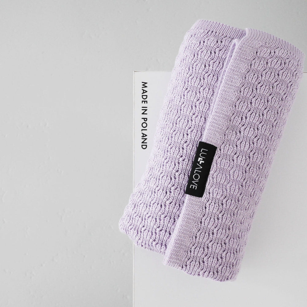 Lullalove letvægts bambus baby tæppe i en smuk lavendel farve med et åbent væv, der ligner hundredvis af små sommerfuglevinger.
