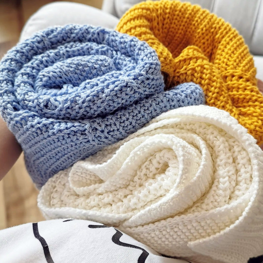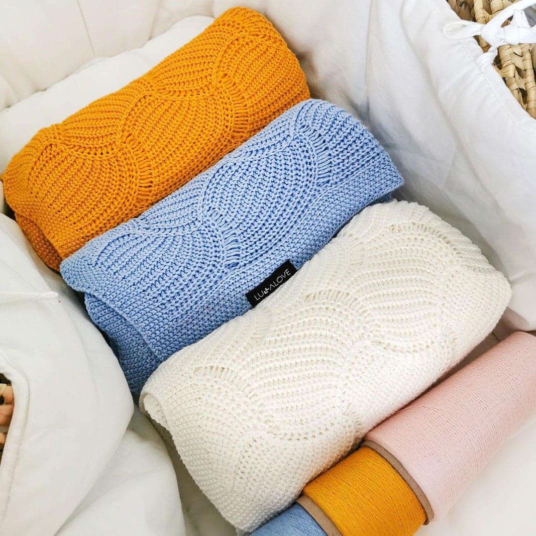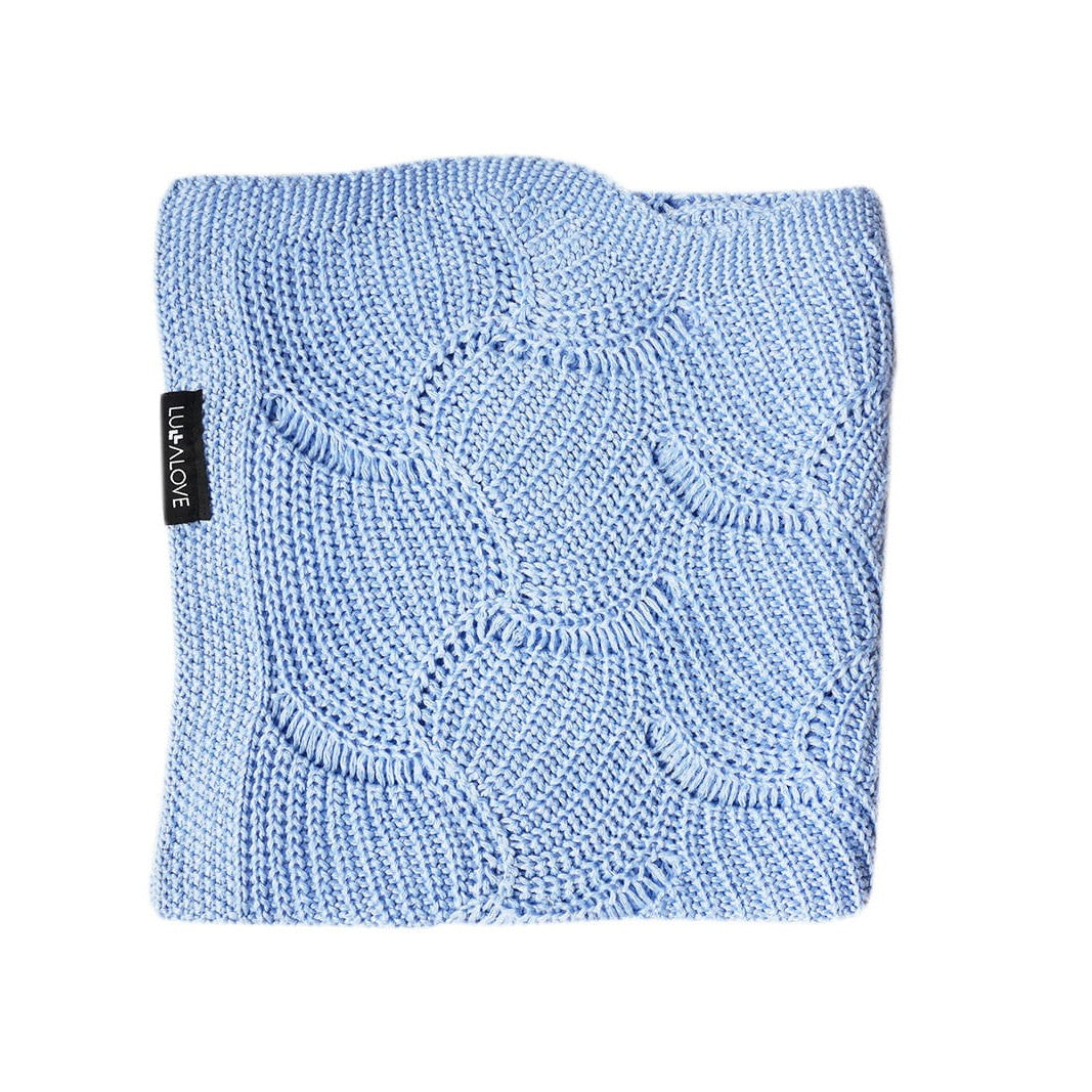 LullaLove bambus-muslingetæppe all-season blue quartz er et tæppe lavet af all-season garn i et væv, som om muslinger var sat sammen.