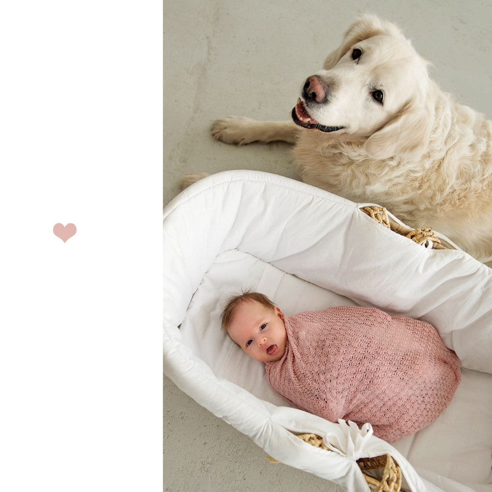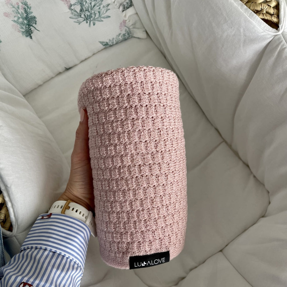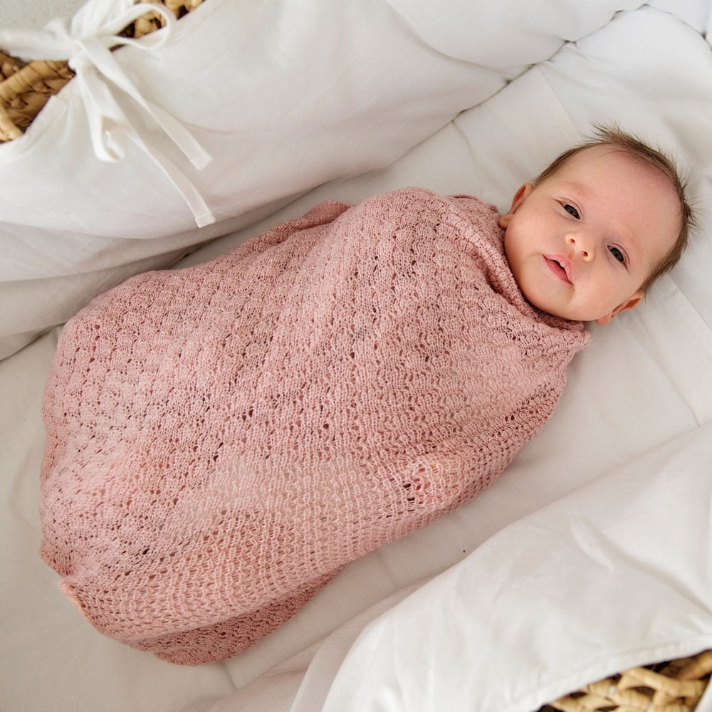Det bløde merinould-sommerfugletæppe i pudderrosa kan også bruges som baby-slynge fra LullaLove.