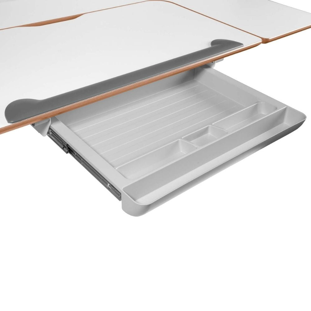 Skrivebordet er udstyret med: 1. en stor skuffe på 57x35x5, der er designet som en organiseringsenhed. Den har 4 rum. 2. på bordpladen er der en speciel ergonomisk magnetisk håndledsstøtte. Den har også den funktion, at den kan holde f.eks. en notesbog, når bordet vippes. |