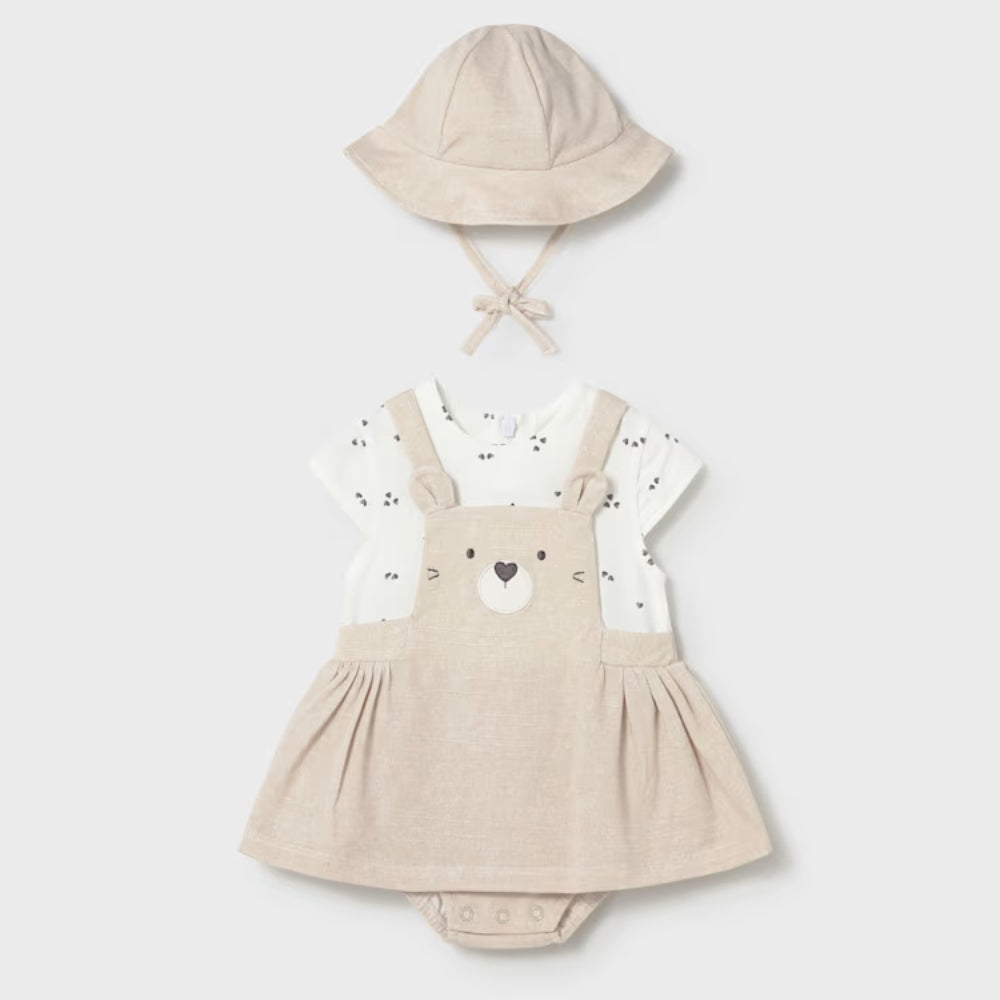 Mayoral 2-delt sæt til piger med kjole, imiterede smækbukser og kasket Hvede