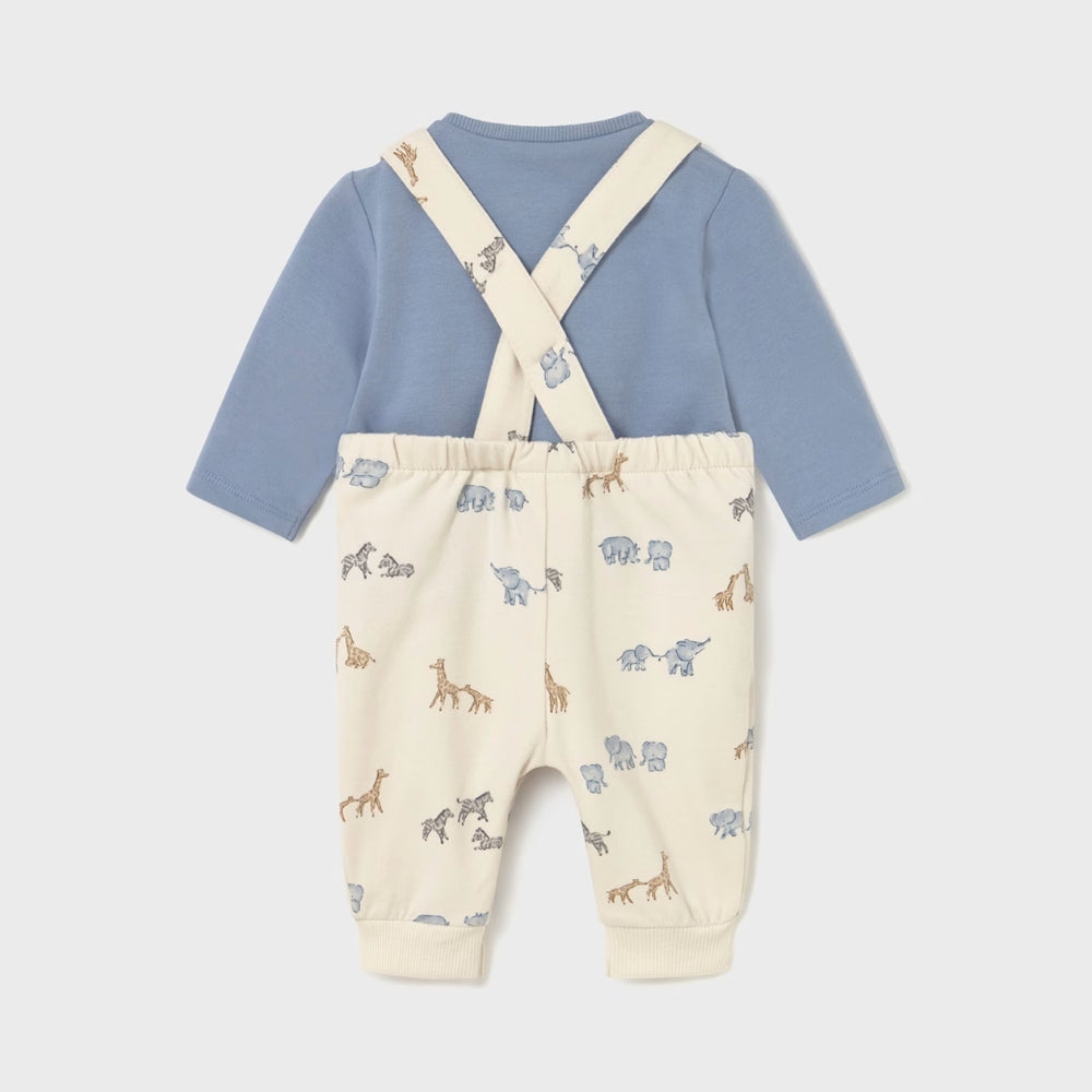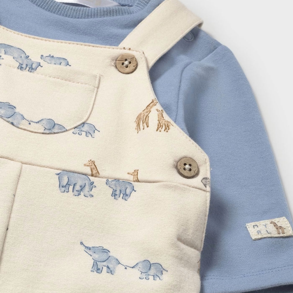 Blåt babysæt med smækbukser og T-shirt fra Mayoral.
