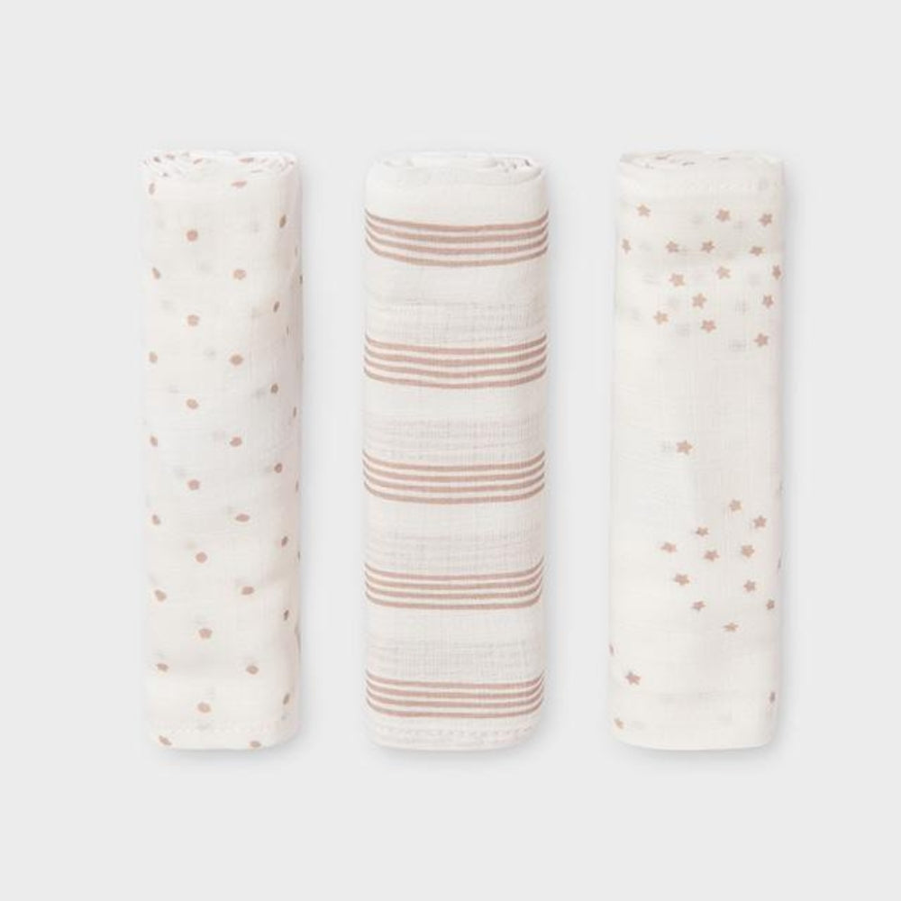 Sættet indeholder tre bløde og behagelige bleer lavet af 100 % bomuld, der er ideelle til babyens følsomme hud.