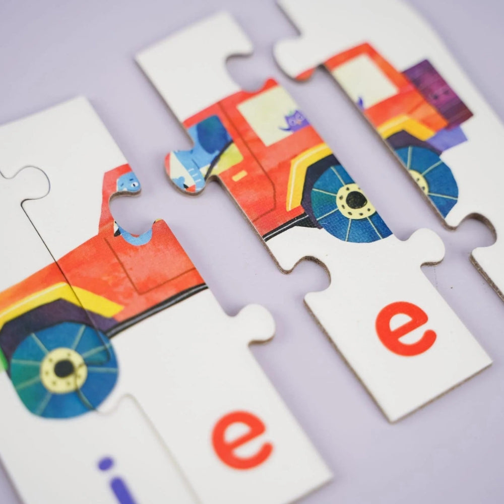 Sættet indeholder 80 brikker, som giver barnet mulighed for at udvikle finmotorikken og lære at genkende bogstaver og læse.
