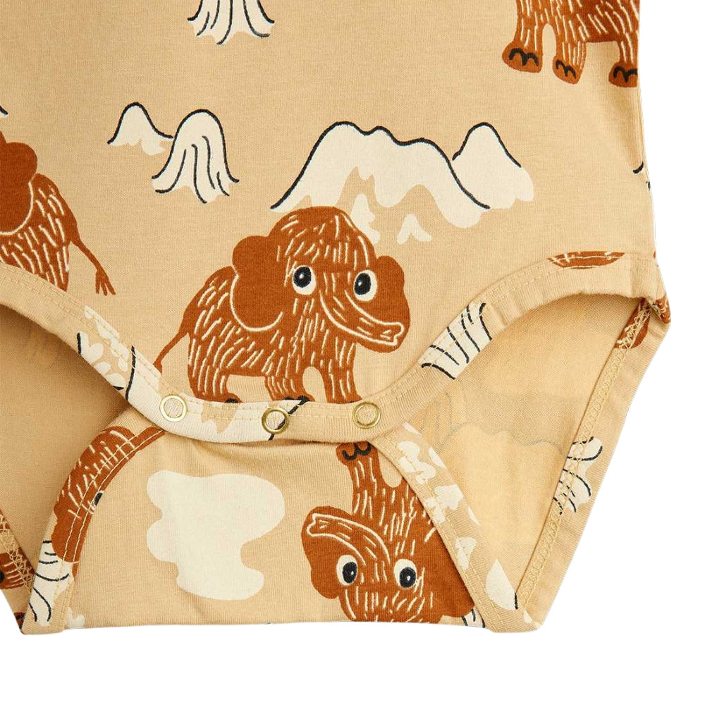 Sættet består af en langærmet body og leggings, begge dekoreret med et sjovt print, der viser venlige mammutter foran et bjerglandskab.