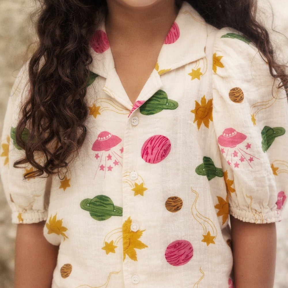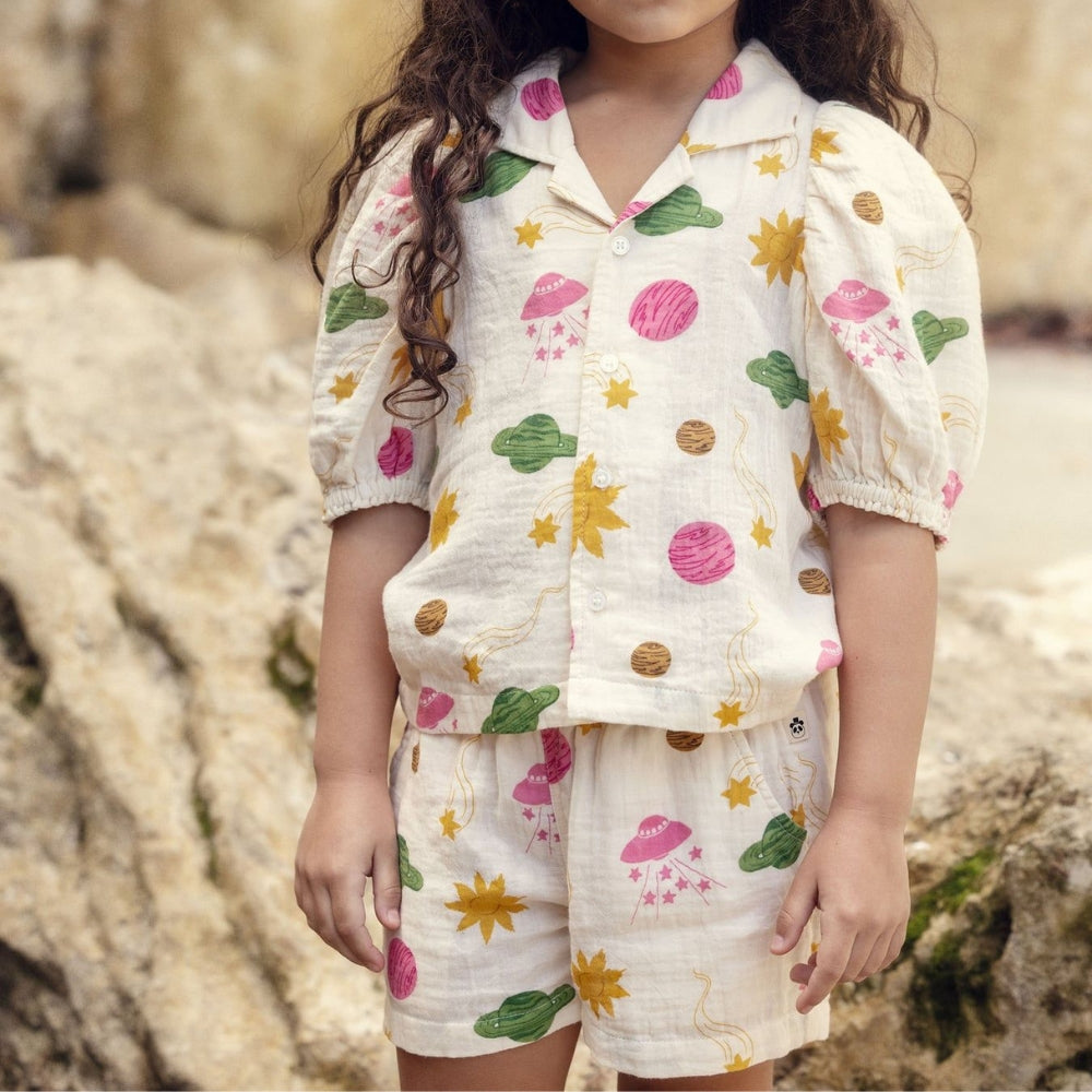 Die Mini Rodini Bluse für Mädchen ist ein einzigartiges Stück Kindergarderobe, das bequemen Tragekomfort mit einem originellen kosmischen Design verbindet.