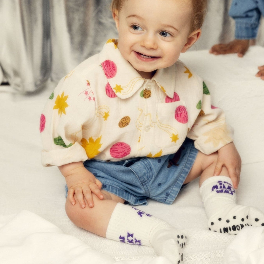 Das von Mini Rodini entworfene Modell begeistert mit einem farbenfrohen Muster voller Planeten, Sonnen, Sterne und UFOs, das dem alltäglichen Styling eine fröhliche und kreative Note verleiht.