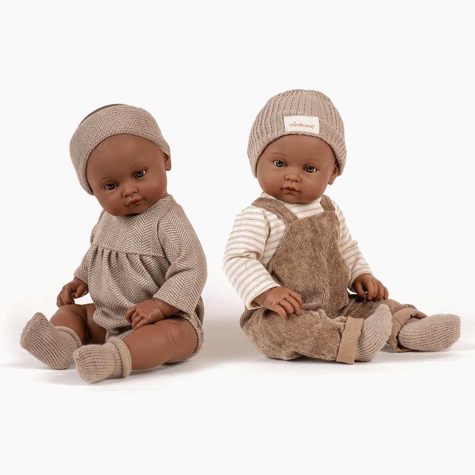 Dukken er 47 cm høj og kommer klædt i et sæt bestående af: en beige jumpsuit med fiskebensmønster, et beige pandebånd med fiskebensmønster og et par mørkegrå sokker.