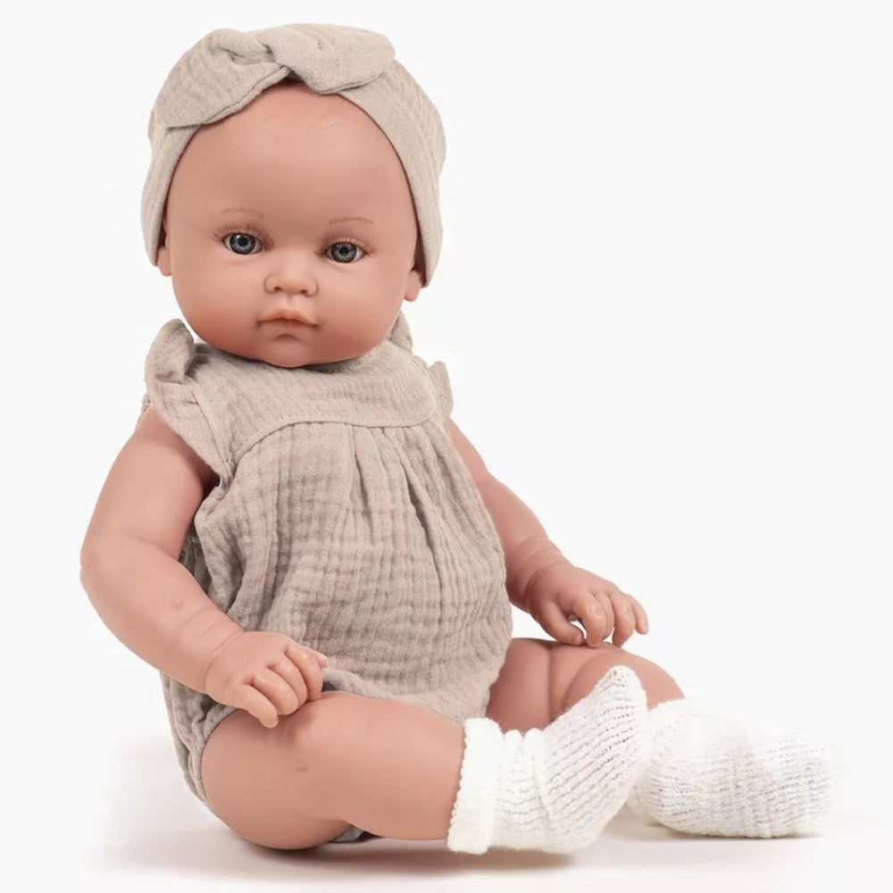 Yaëlle-modellen er 47 cm høj og er klædt i et delikat Charlotte-sæt: kjole, trusser, pandebånd og sokker, alt sammen lavet af blødt dobbeltgaze-bomuld.