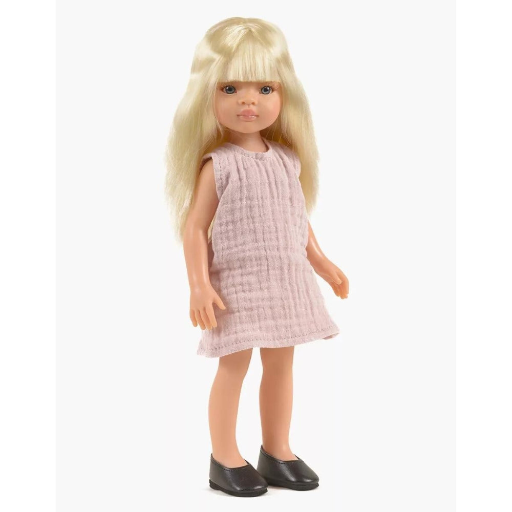 Dukken er 32 cm høj og kommer med en smuk lyserød kjole, undertøj og sorte sko.