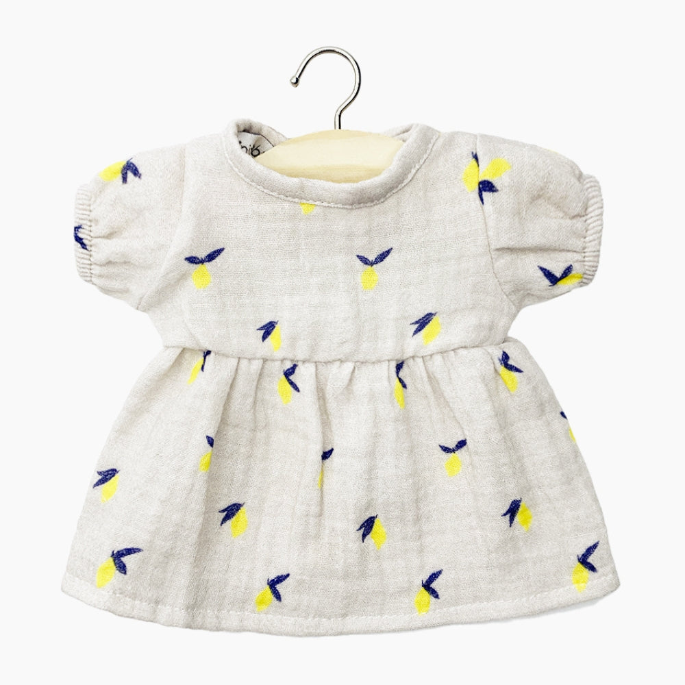 Kjole til dukke i gråt med et smukt citronmotiv.