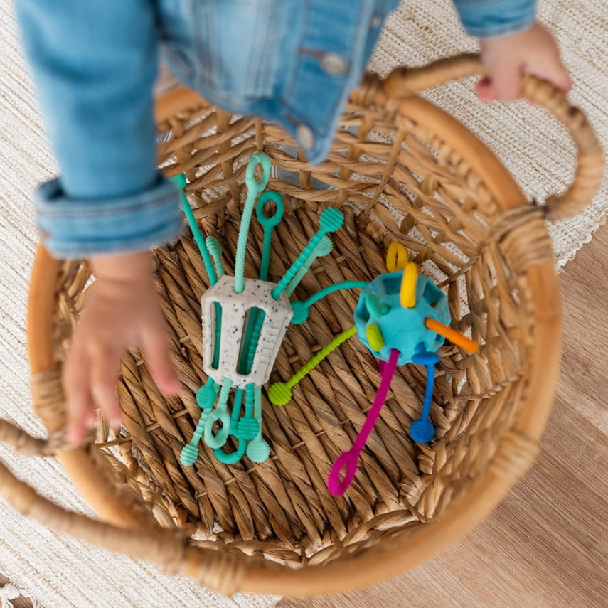Seks farverige snore af blødt silikone, hvor hver snor har forskellig tekstur og form i enderne, så småbørn kan trække og slæbe dem gennem legetøjet, mens de udvikler motoriske færdigheder og fantasi.