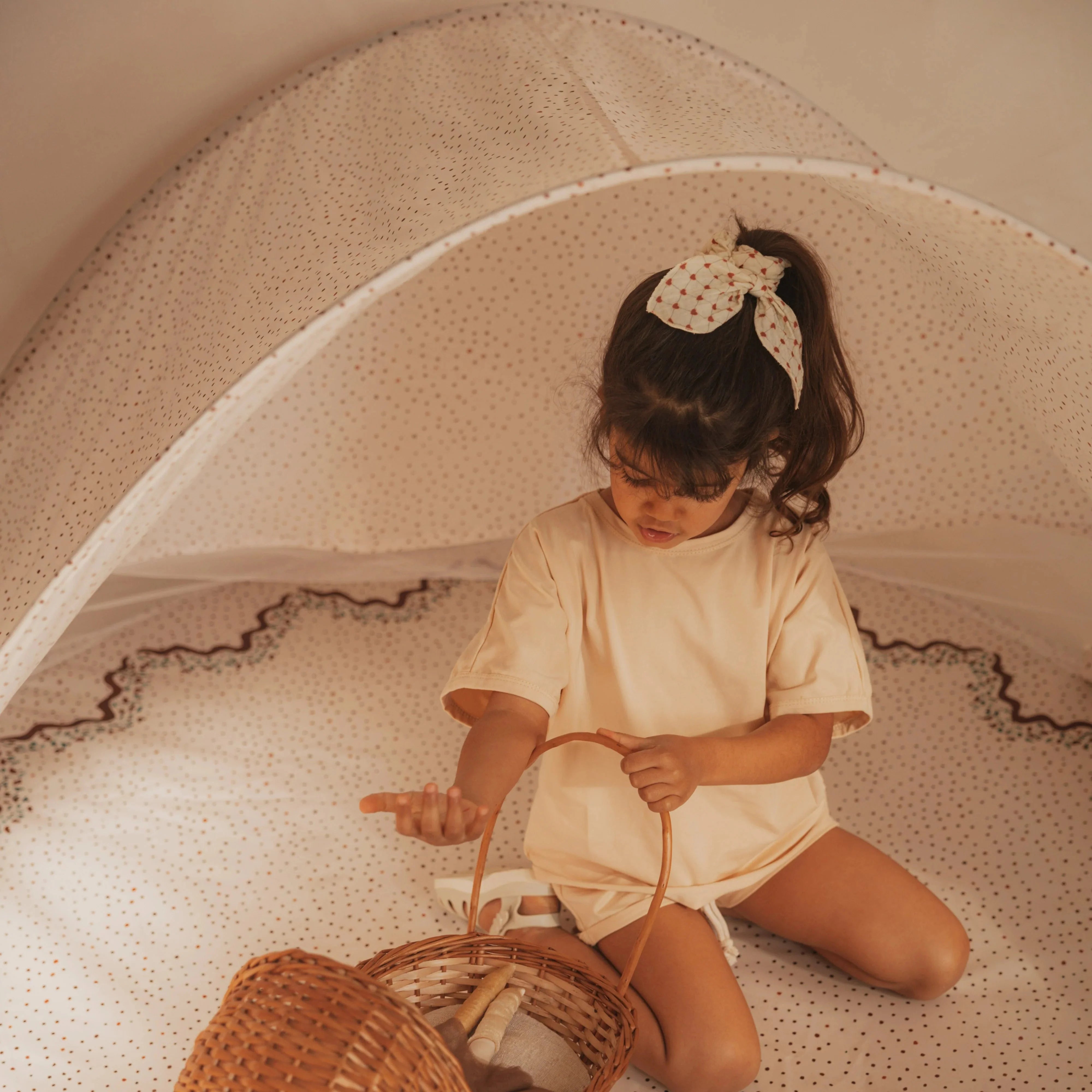 Det unikke foldbare strandtelt fra Mrs Ertha er et magisk sted at lege, hvile og slappe af.