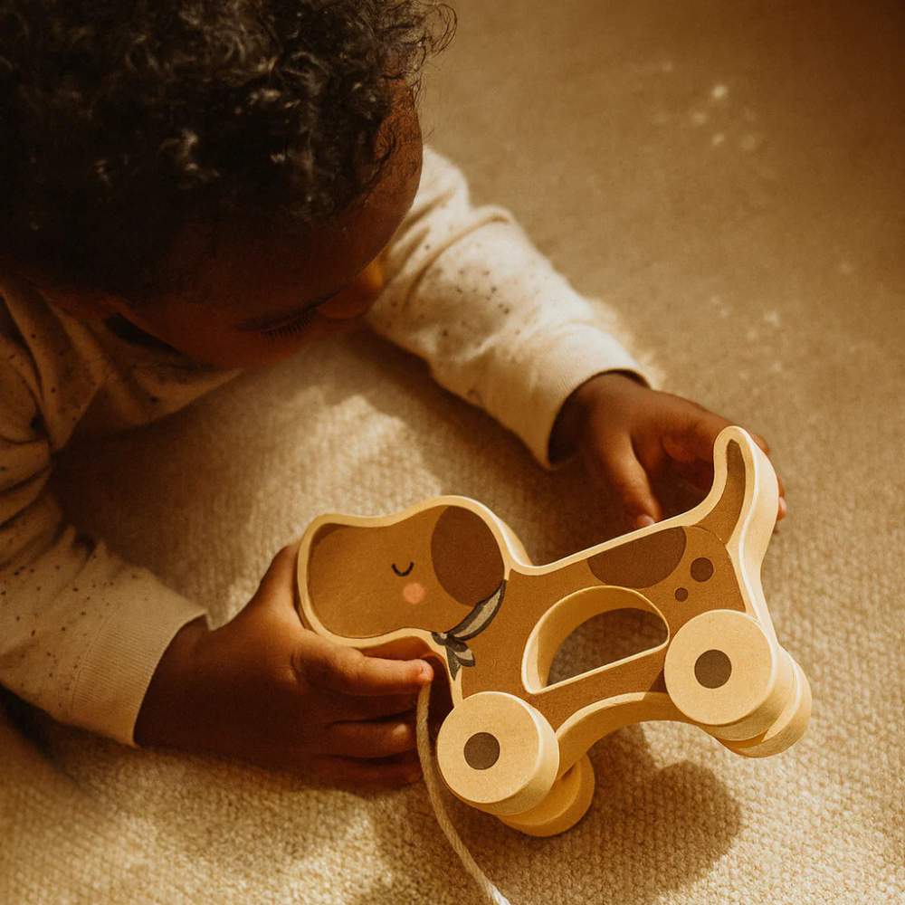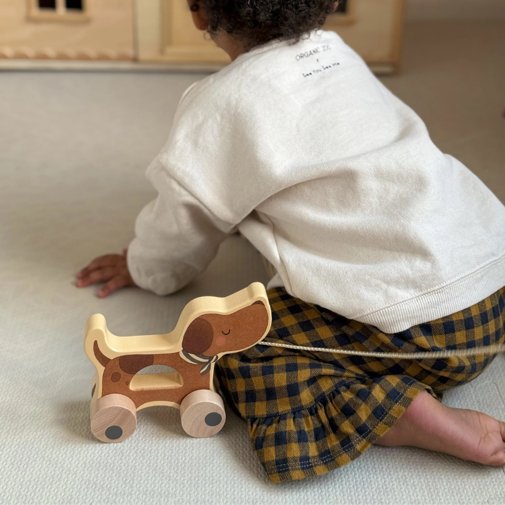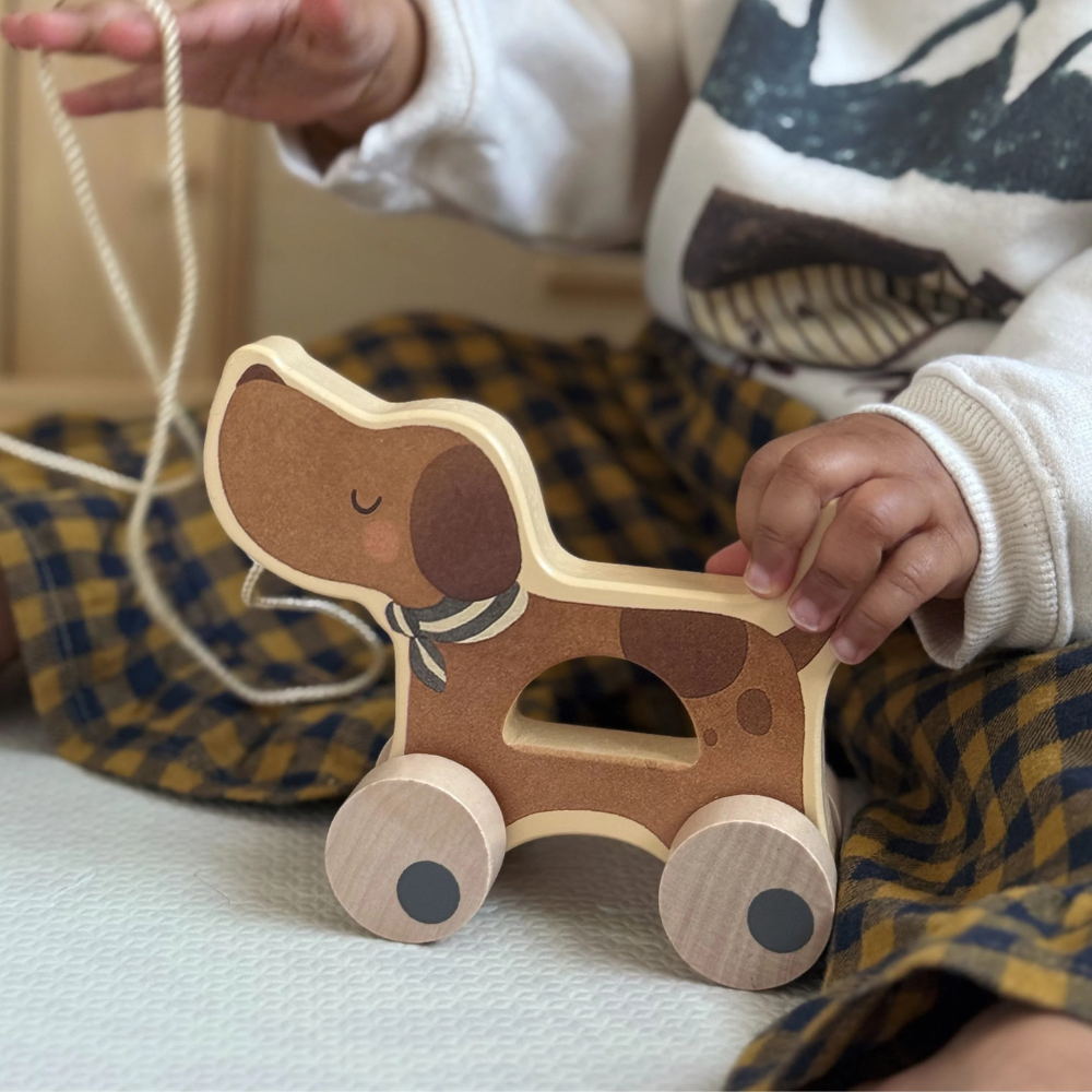 Hund med træhjul fra Mrs Ertha er en sød ledsager til de første gåture og hverdagens eventyr.