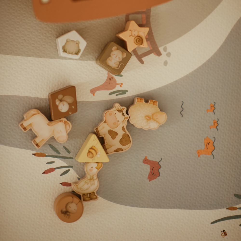 I tråd med Montessori-pædagogikken guider legetøjet barnet gennem handling: gribe, matche, sammenligne, gentage.
